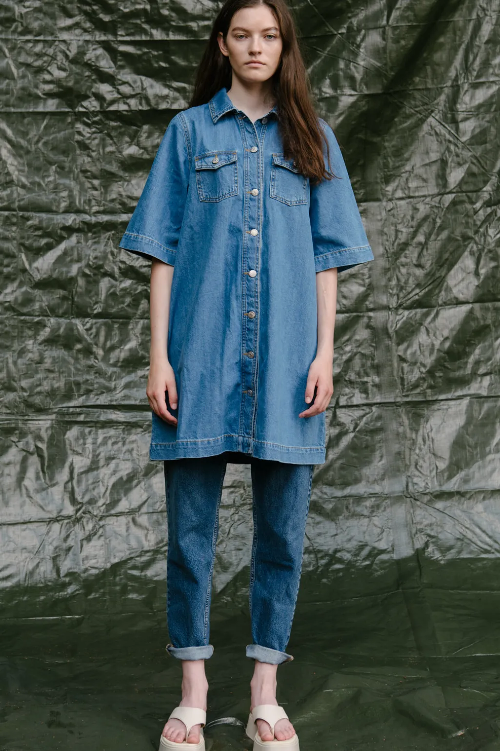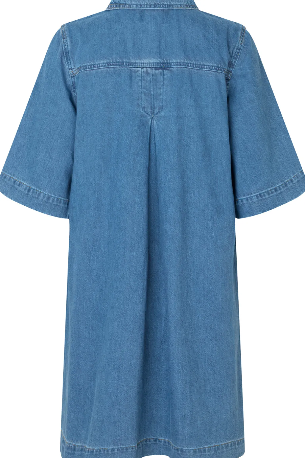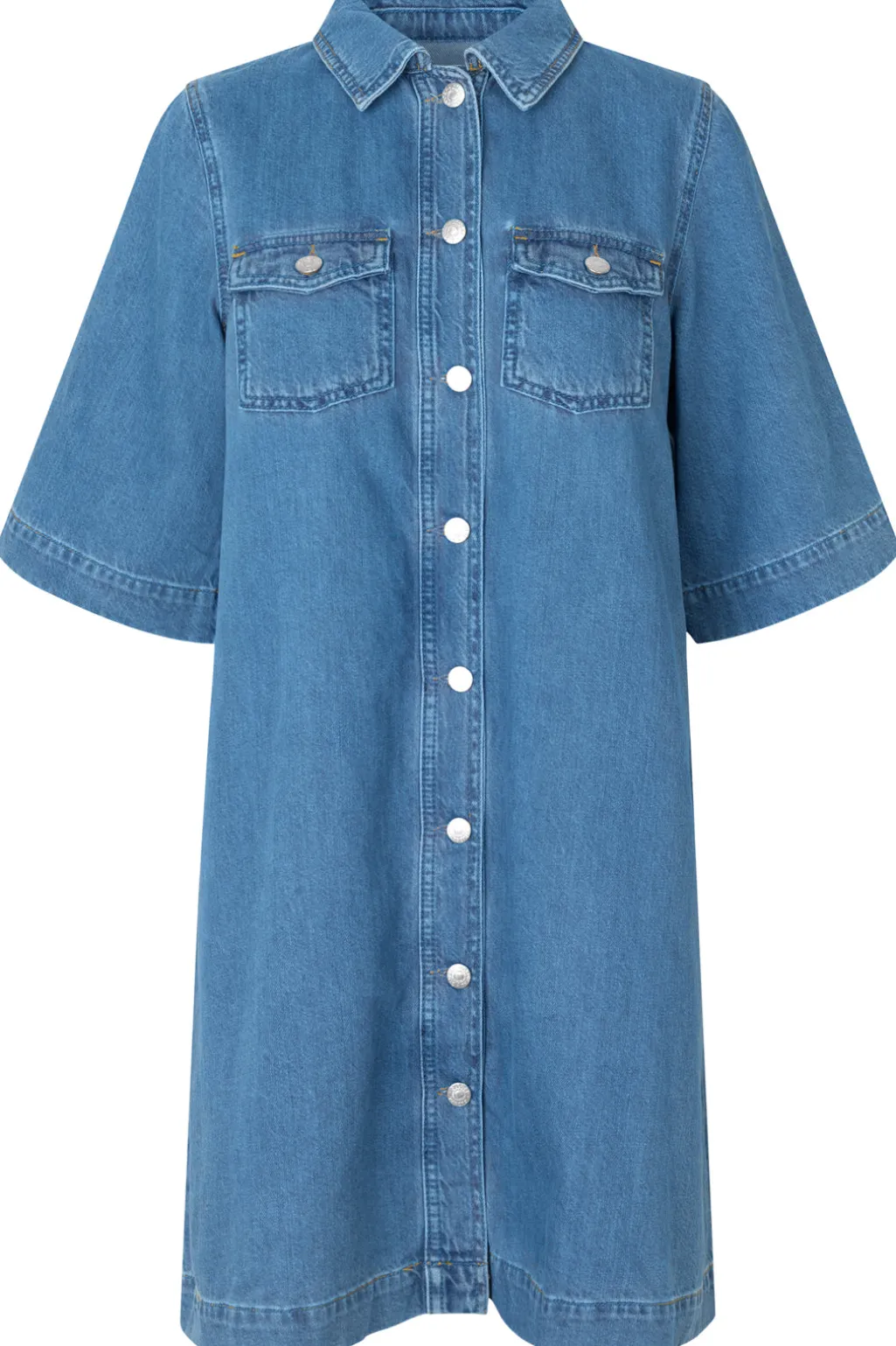 Denimkjole i mellemblå bomuld med skjortekrave og 3/4 ærmer. Kjolen har knapper hele vejen ned foran og to brystlommer med dekorative syninger.