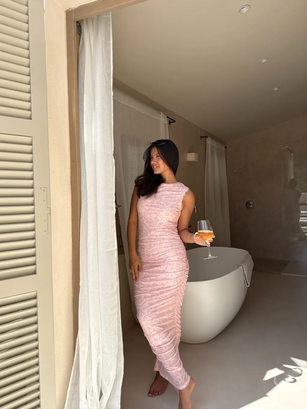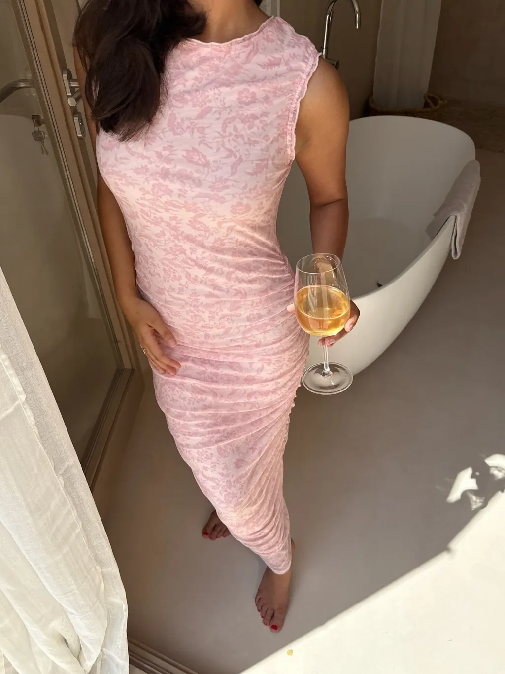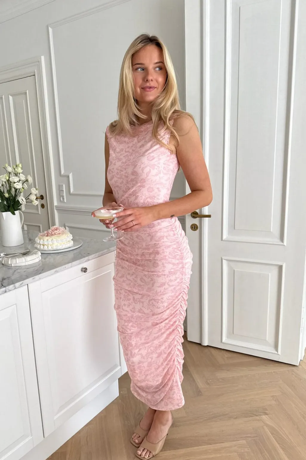 Elegant lang kjole i et lyserødt blomsterprint med en kropsnær silhuet.Kjolen har korte ærmer og en rund halsudskæring. Kantene på kjolen har flæsedetaljer, og rynkerne på siderne giver dig mulighed for at justere længden for et kortere look.True to size.