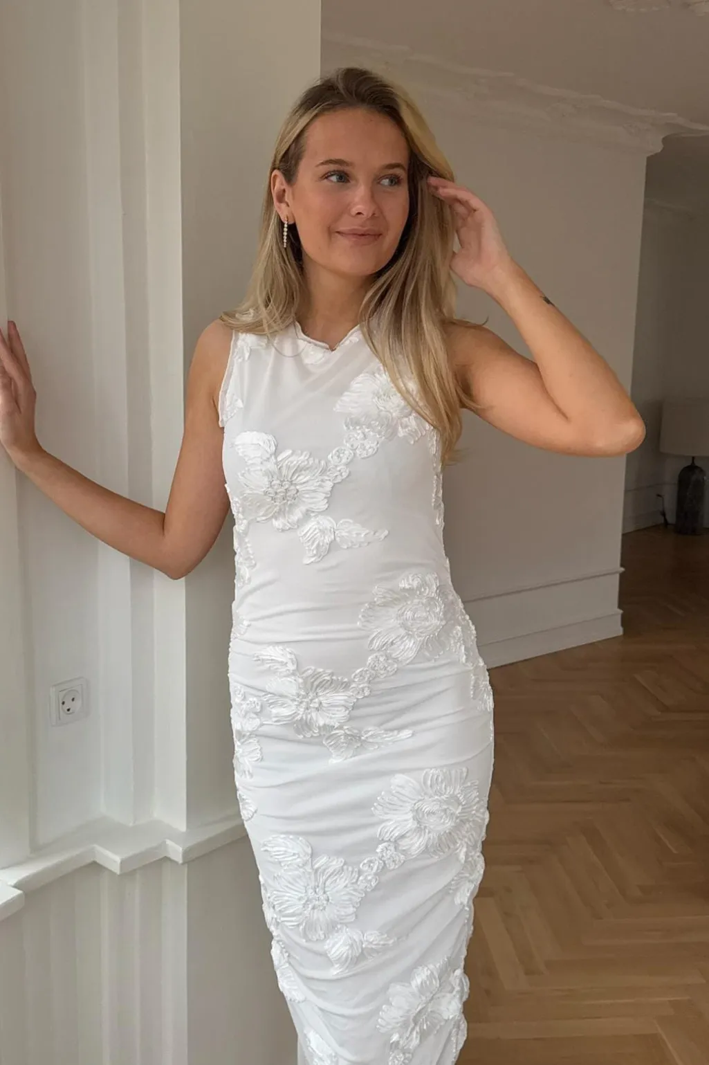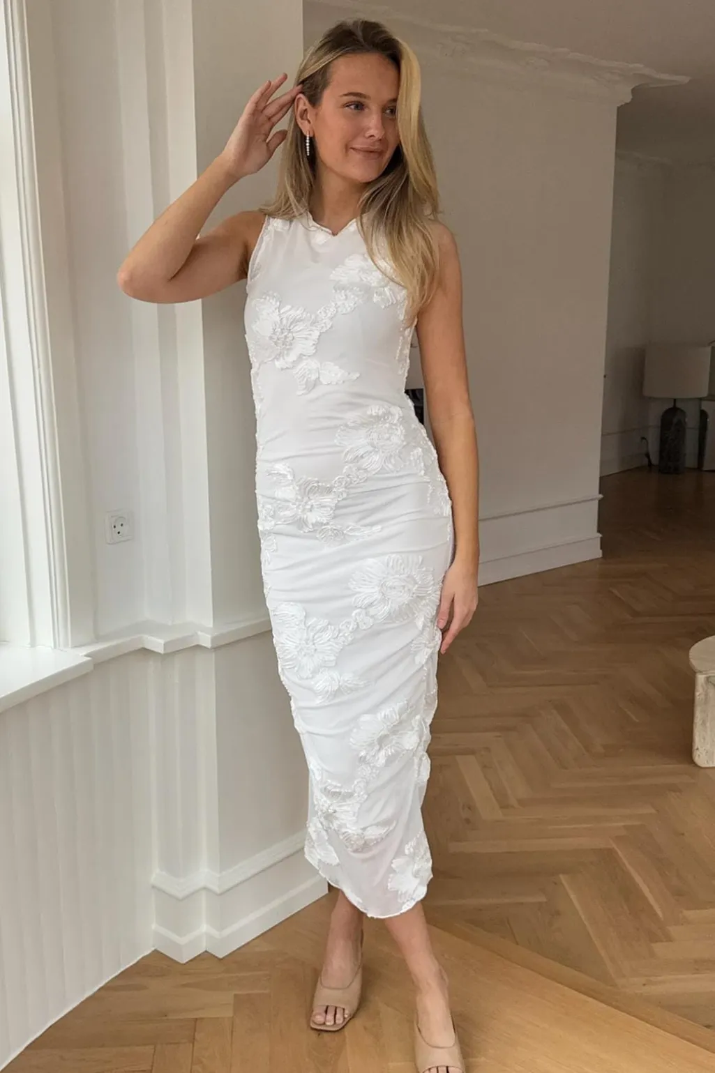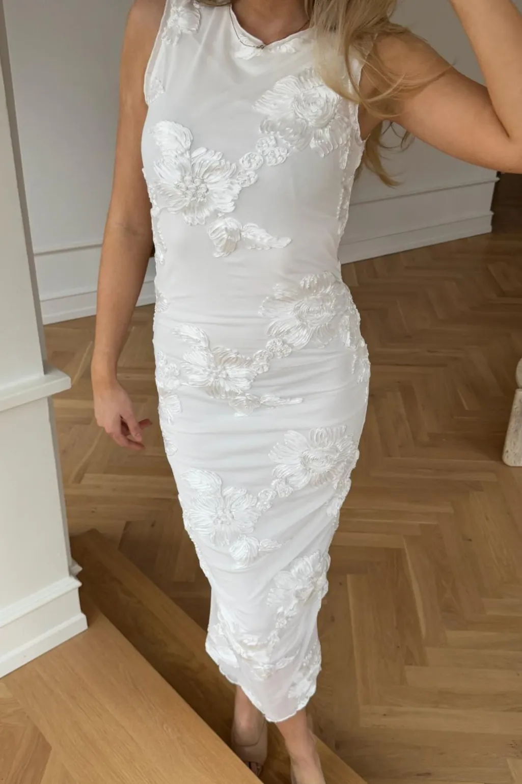 Hvid mesh-kjole fra BYIC med broderede 3D-blomster og rynkedetaljer på siderne. Kjolen har en tætsiddende pasform og små flæser ved skuldrene.