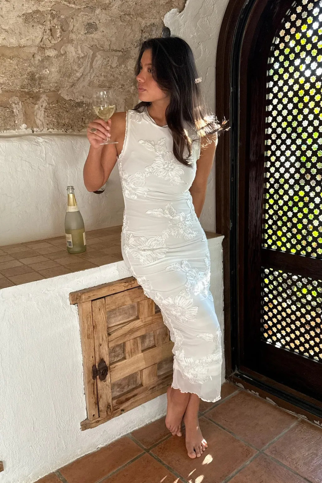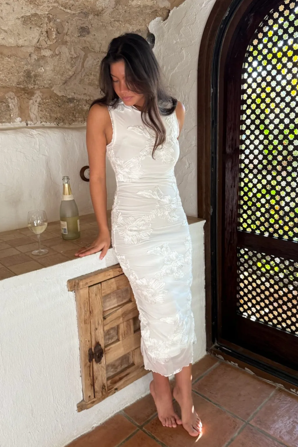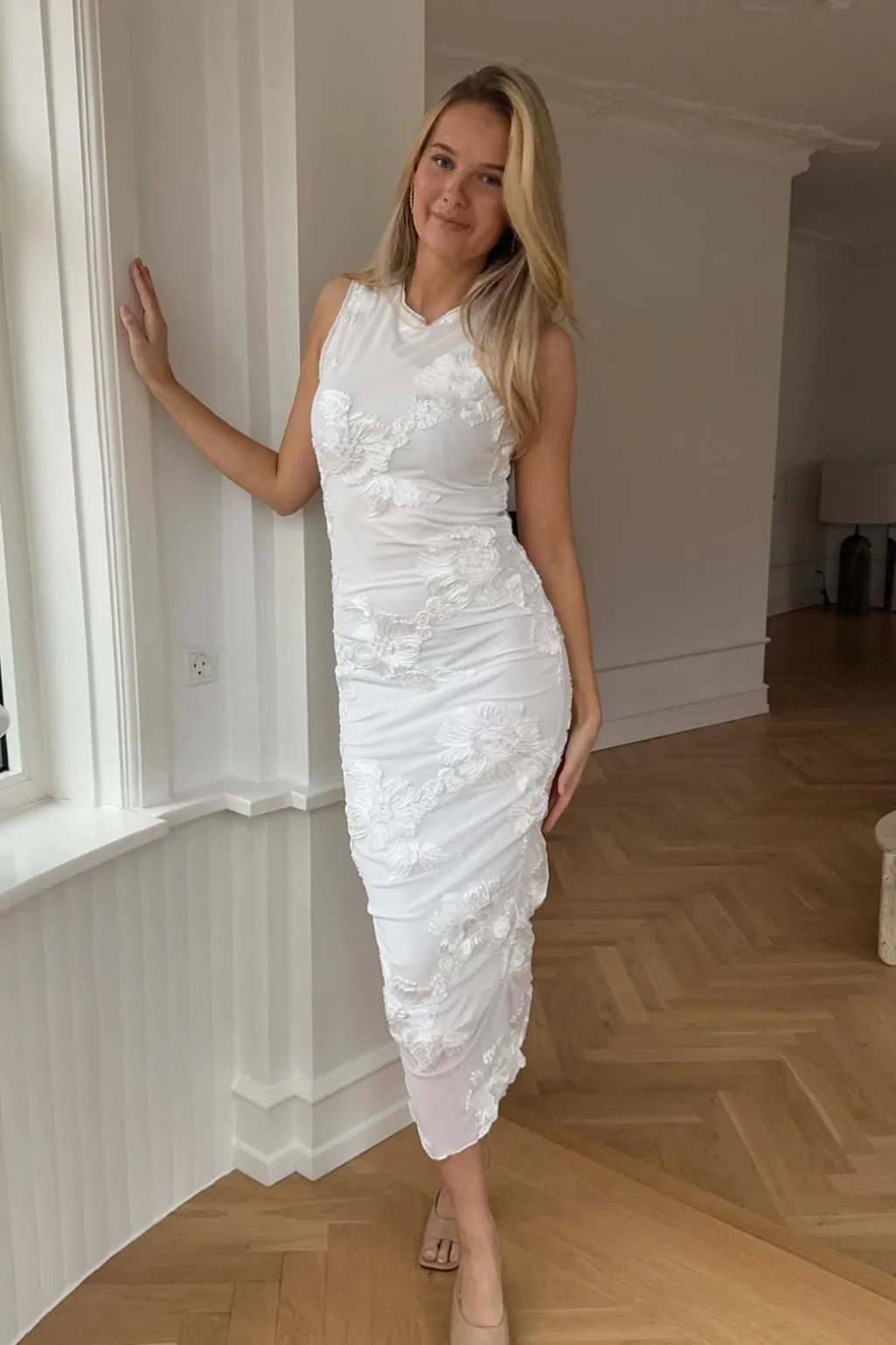 Hvid mesh-kjole fra BYIC med broderede 3D-blomster og rynkedetaljer på siderne. Kjolen har en tætsiddende pasform og små flæser ved skuldrene.