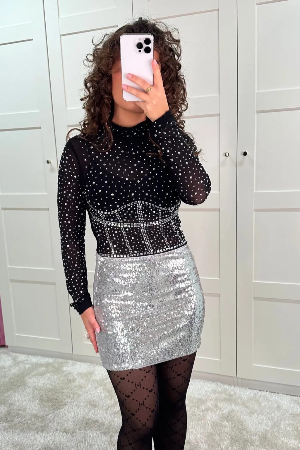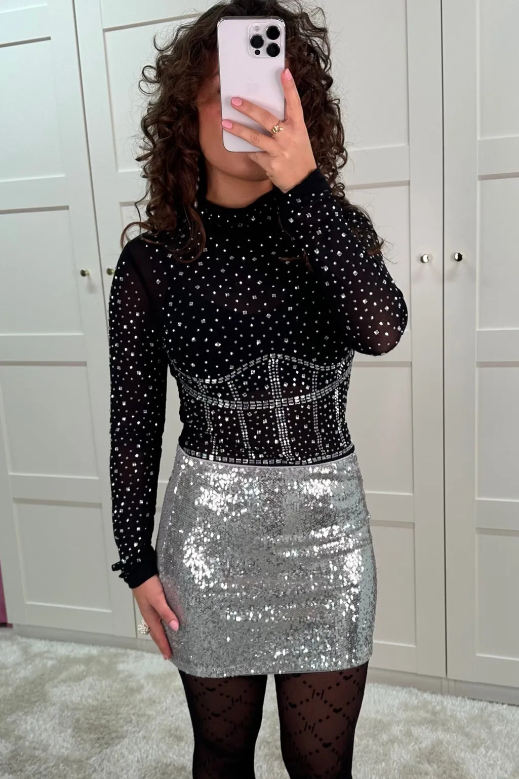 Designet med fine perler og skinnende rhinsten, tilbyder denne sorte bodysuit en kombination af komfort og stil.