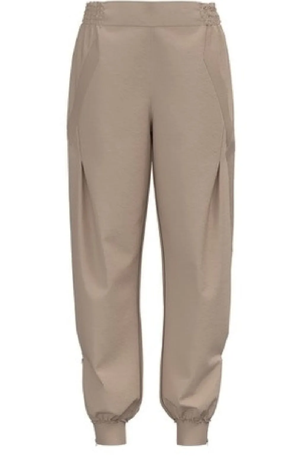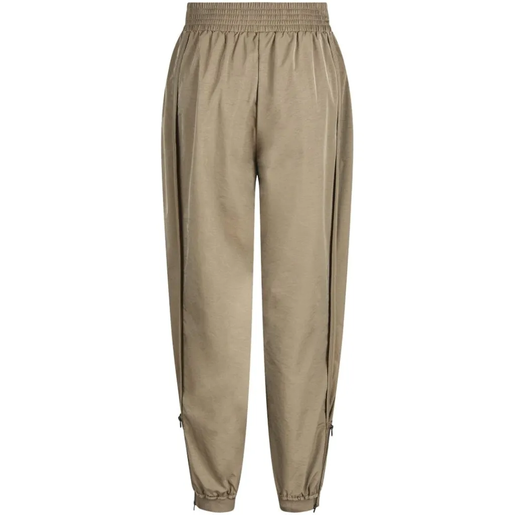 Bukser fra Gossia i lys kamelnuance med løs pasform. Linningen er fast foran med smock i siderne og bagpå, og benene har ribkant og lynlås ved anklerne.