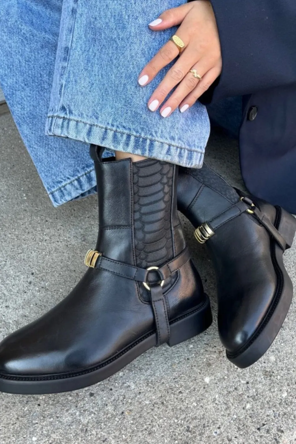 Sorte læderstøvler fra Copenhagen Shoes med gyldne spænder og mønstrede paneler på siderne. Støvlerne har en lav hæl og rund tå.