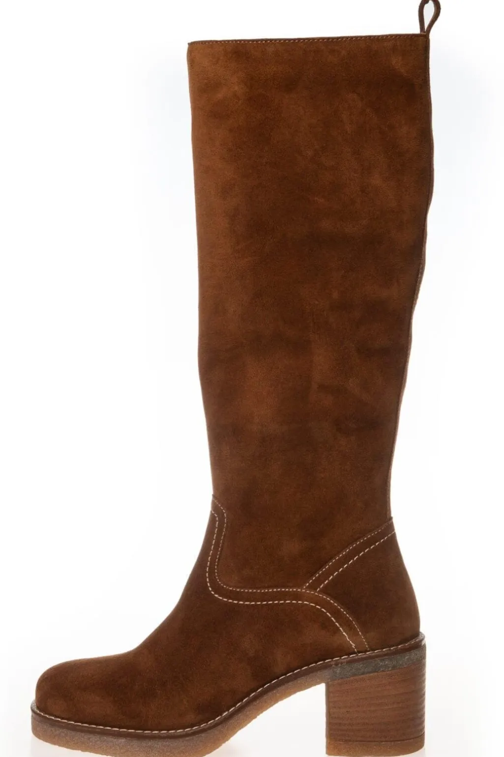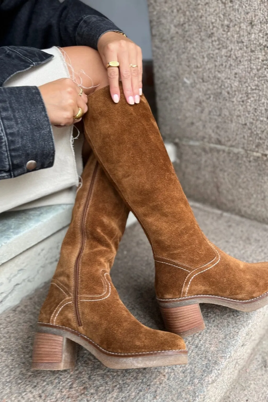 Knæhøj støvle fra Copenhagen Shoes i brun ruskind. Støvlen har en blokhæl på 8-10 cm og rund tå med dekorative syninger.