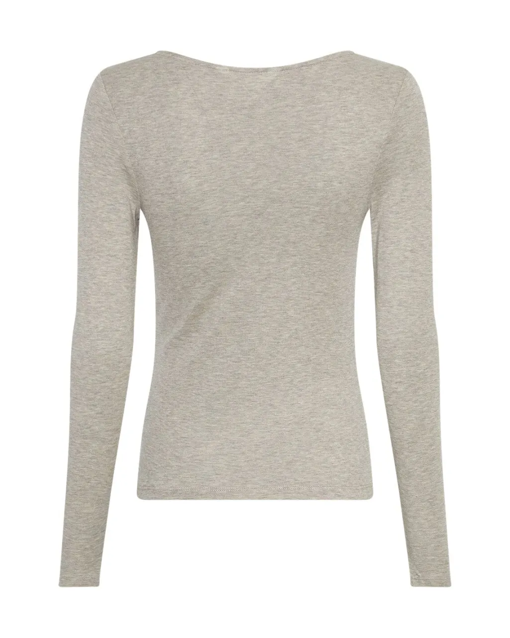 Langærmet top fra Moss Copenhagen i en grå melange. Toppen har et asymmetrisk snit med rynkedetaljer på den ene side.