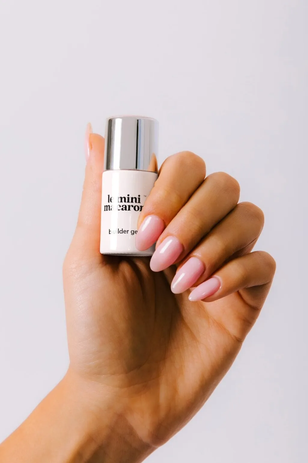 Buildergel til negle med transparent finish og diskret pink skær. Gelen fungerer både som primer og base, der beskytter de naturlige negle.