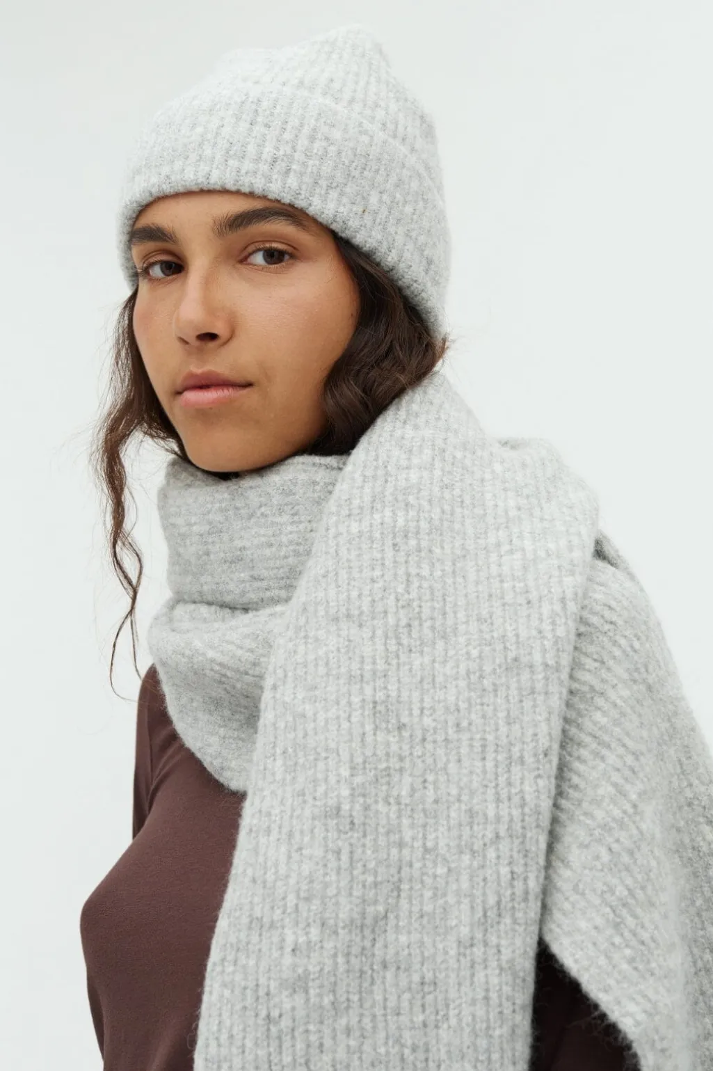 Lys grå meleret hue fra MbyM med ribbet tekstur og foldet kant. Huen er strikket i en blanding af syntetiske og naturlige fibre.