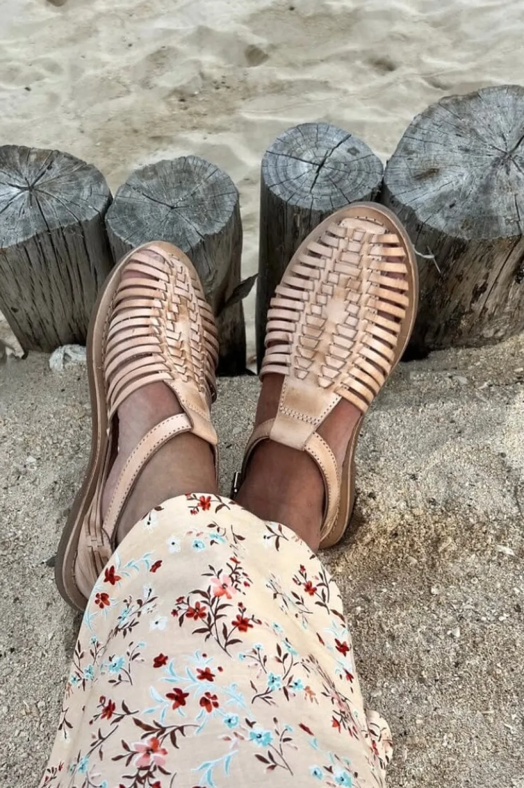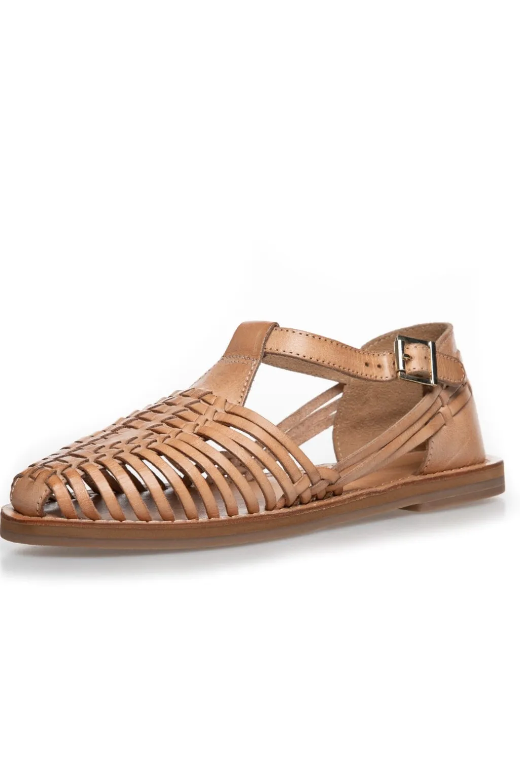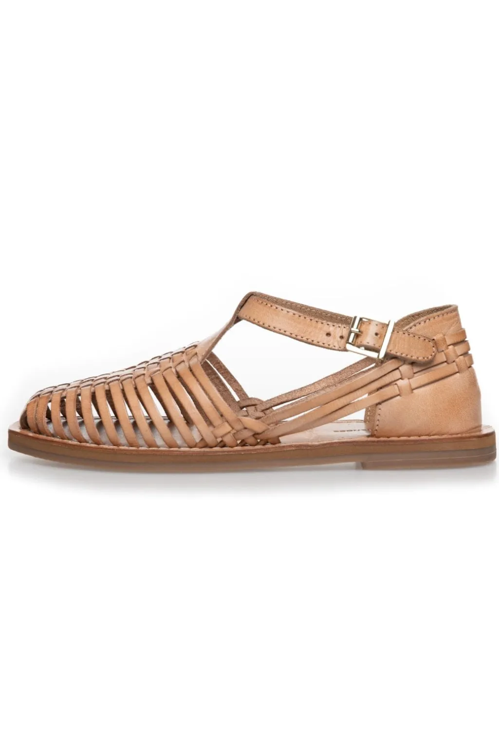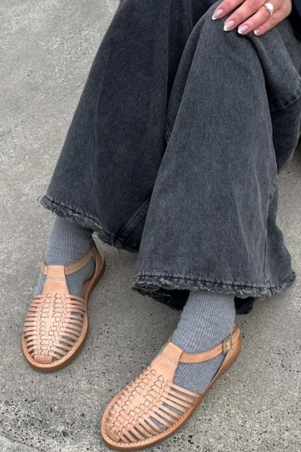 Sandal fra Copenhagen Shoes i naturfarvet læder med flettede remme. De bløde remme og den lukkede hælkappe giver både støtte og ventilation til foden.
