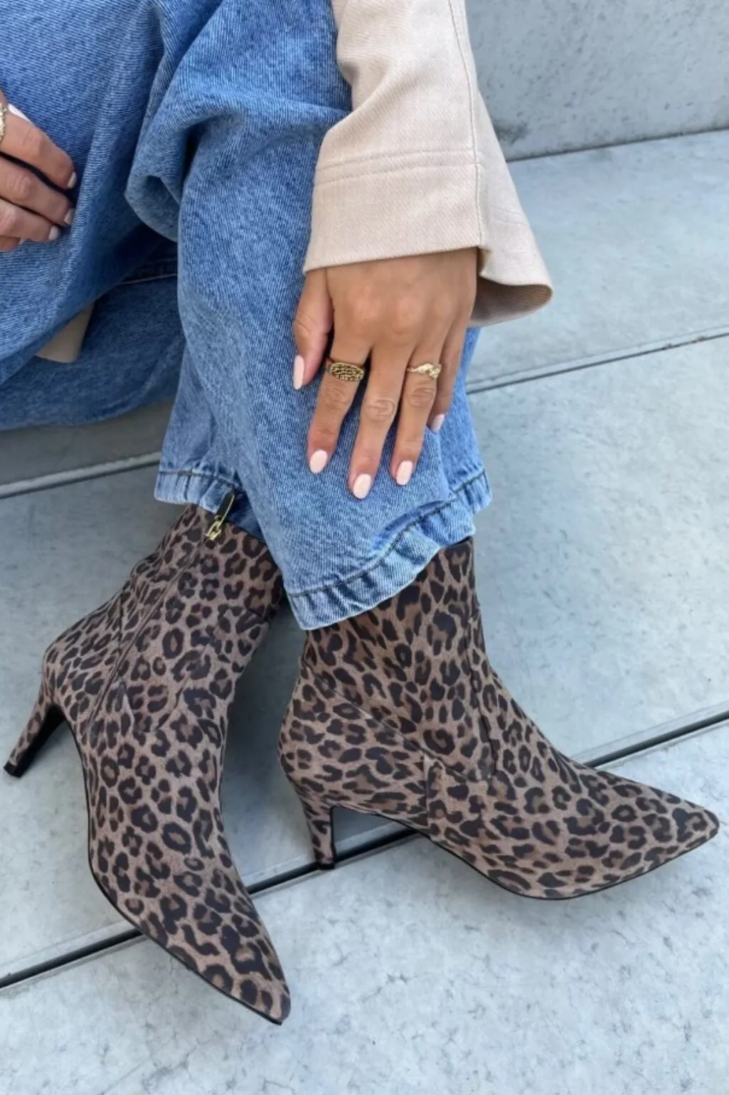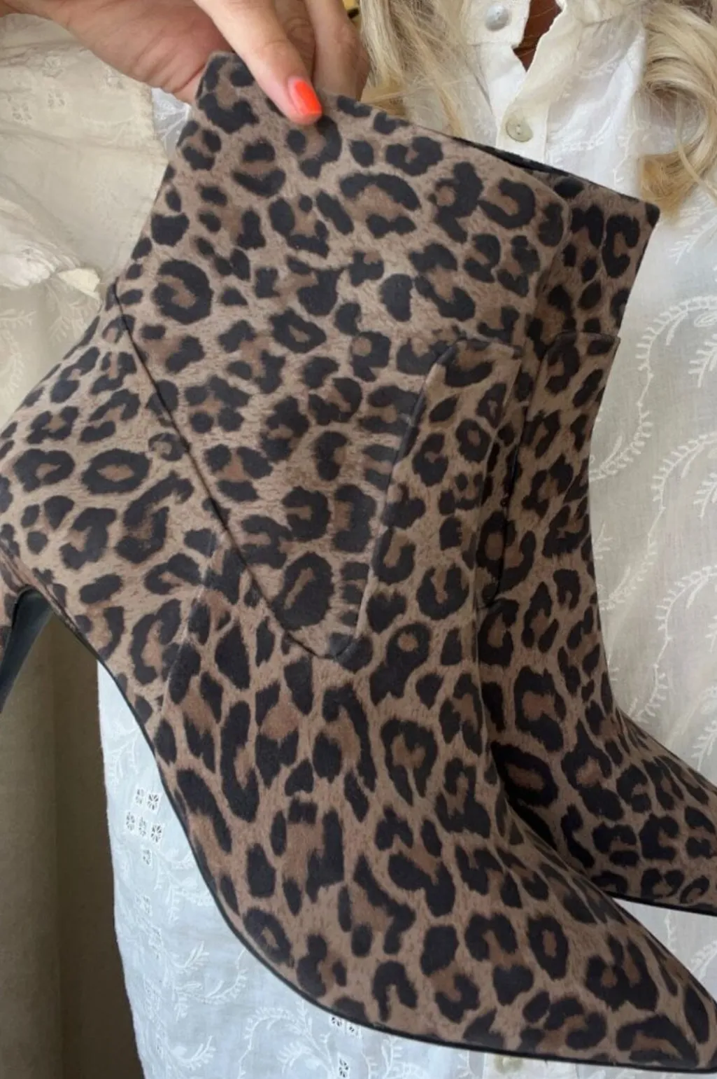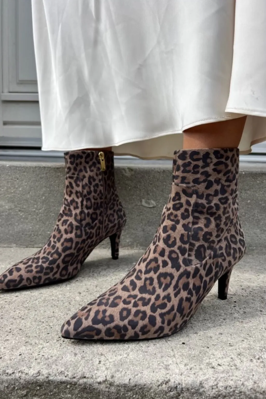 Ankelstøvler fra Copenhagen Shoes i ruskind med leopardprint. Støvlen har spids tå, lynlås på indersiden og en 5-8 cm høj stilethæl.