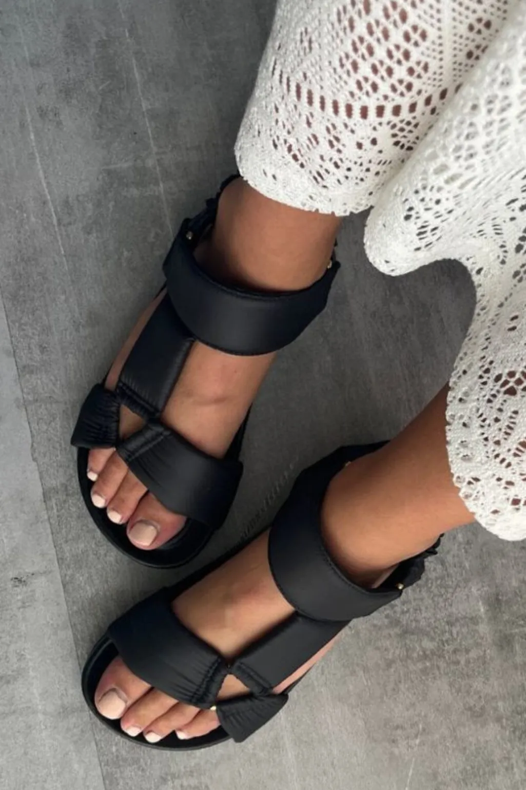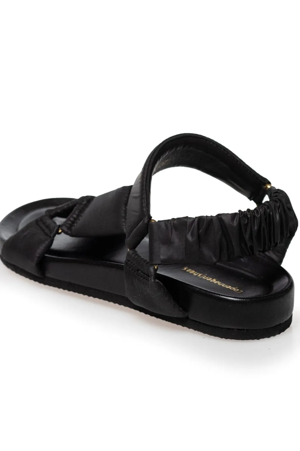 Sorte sandaler fra Copenhagen Shoes med krydsede remme i tekstil. Sandalerne har en elastisk bagrem og velcrolukning, som gør dem nemme at tage af og på. De er fremstillet med en flad EVA-sål.