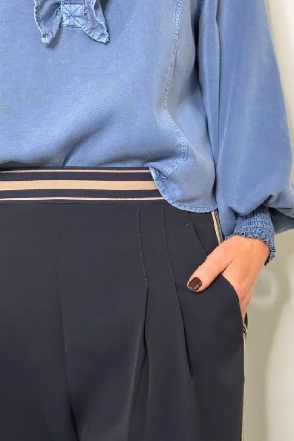 Blå skjorte fra Gossia med rynkedetaljer på fronten. Skjorten har lange ærmer med samlede manchetter og en høj hals med knaplukning.