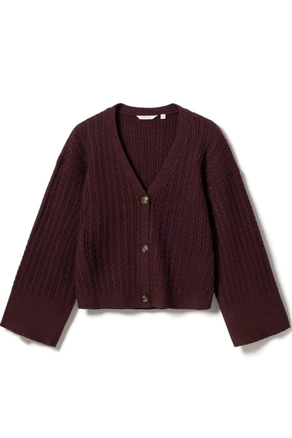 N-Lenyx Knit er en kort, tætsiddende cardigan med fine kabeldetaljer og voluminøse, lige ærmer, der skaber en elegant silhuet.