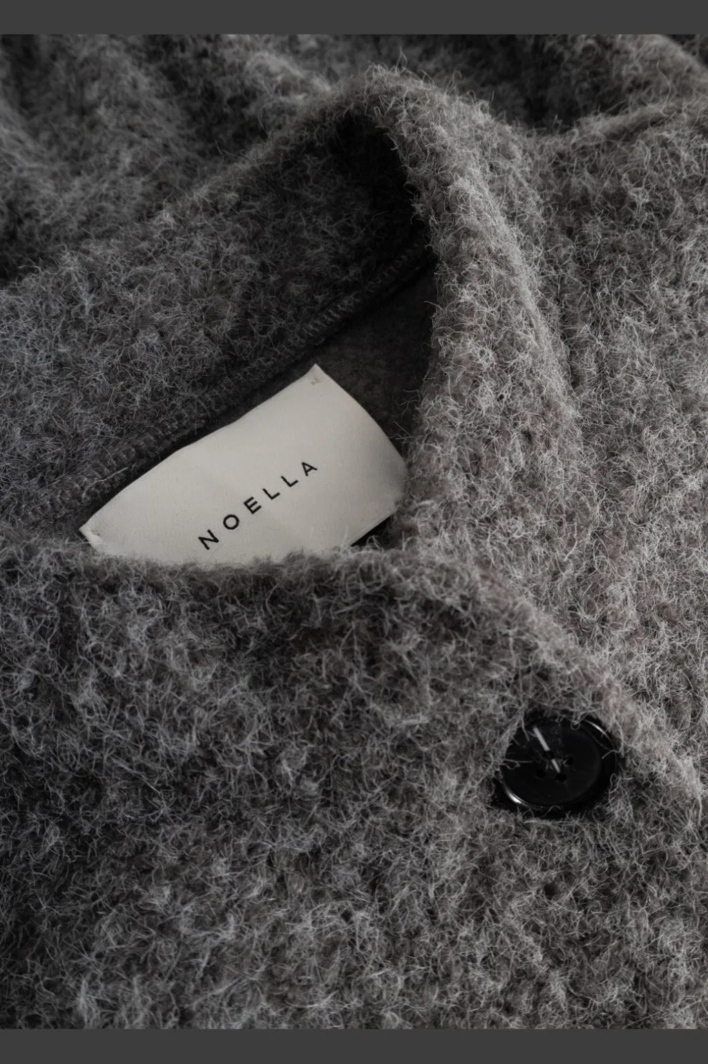 En jakke fra Noella i mørkegrå meleret polyester. Jakken har en rund halsudskæring og lukkes med knapper foran.