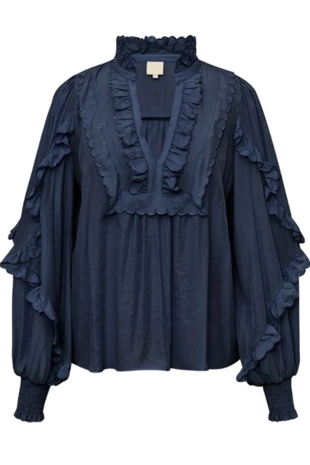 Mørkeblå bluse fra Gossia med flæsedetaljer ved halsen, ærmerne og ryggen. Blusen er lavet af 57 % polyamid og 43 % viskose.