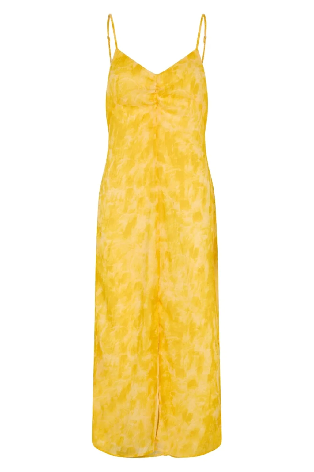 Gul ankellang kjole i printet stof fra Modström. Kjolen har tynde, justerbare stropper og en rynkedetalje ved brystet. En usynlig lynlås i ryggen og en slids foran gør den nem at tage på.