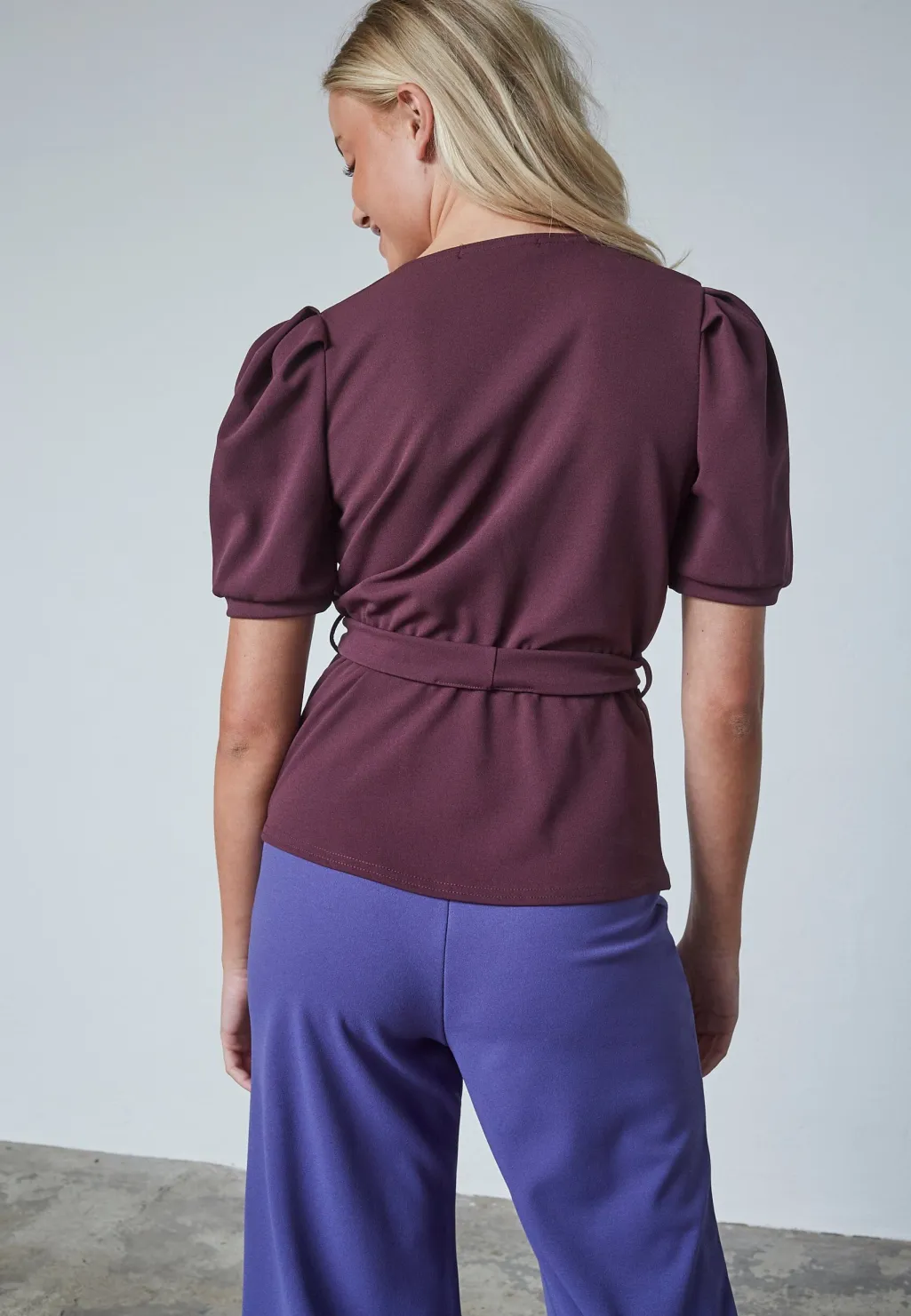 Top fra Sisters Point i dyb bordeaux. Toppen har en V-hals, korte pufærmer og et bindebånd i taljen.