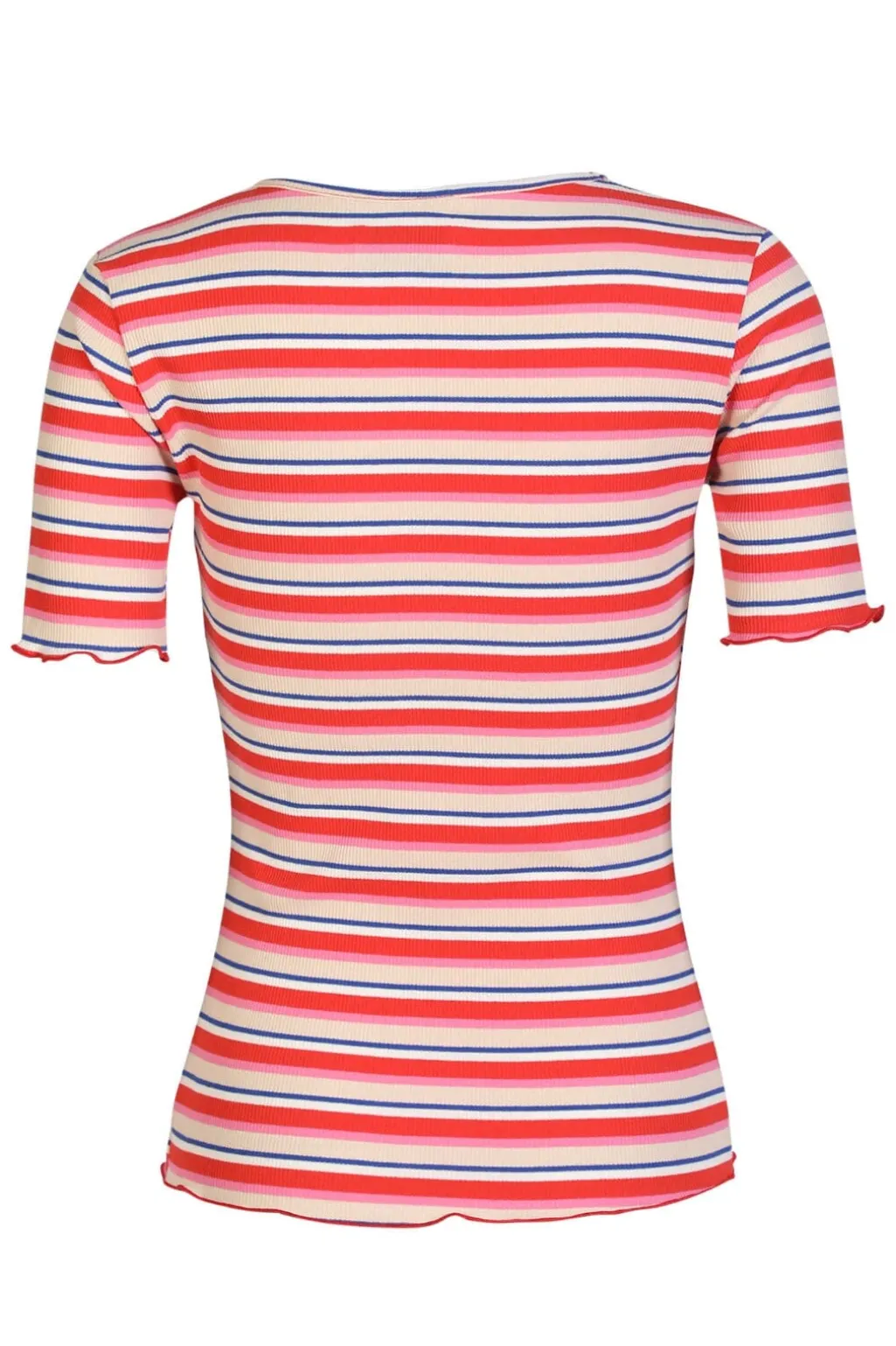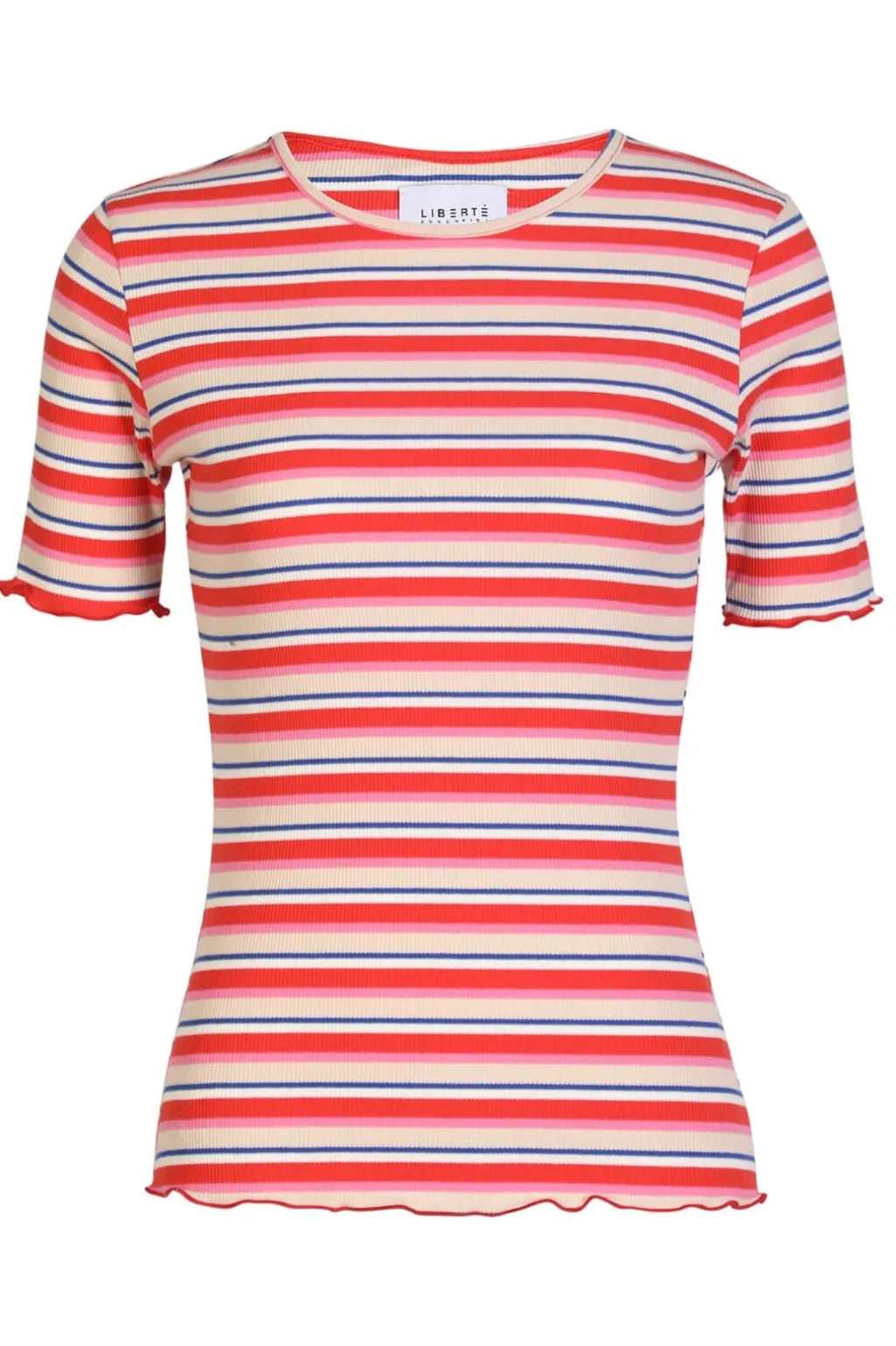 Stribet bluse fra Liberte med korte ærmer og rund hals. Blusen har et sommerligt stribemønster i creme, orange og blå nuancer med bølgede kanter på ærmerne.