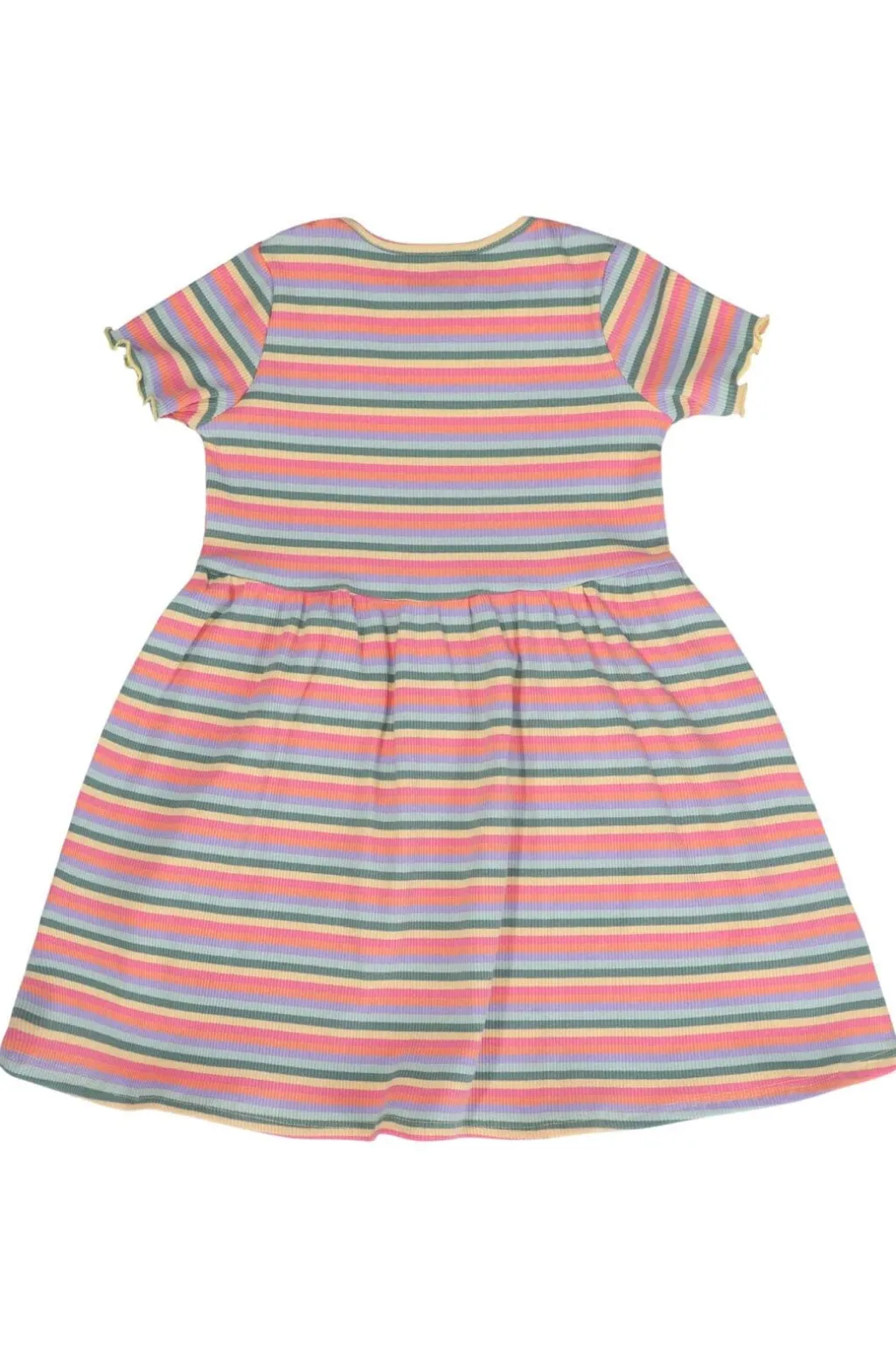 Stribet kjole fra Liberte Ami med et farverigt mønster i orange, pink, grøn og blå. Kjolen har korte ærmer med flæser og en udvidet nederdel, der giver god bevægelsesfrihed.