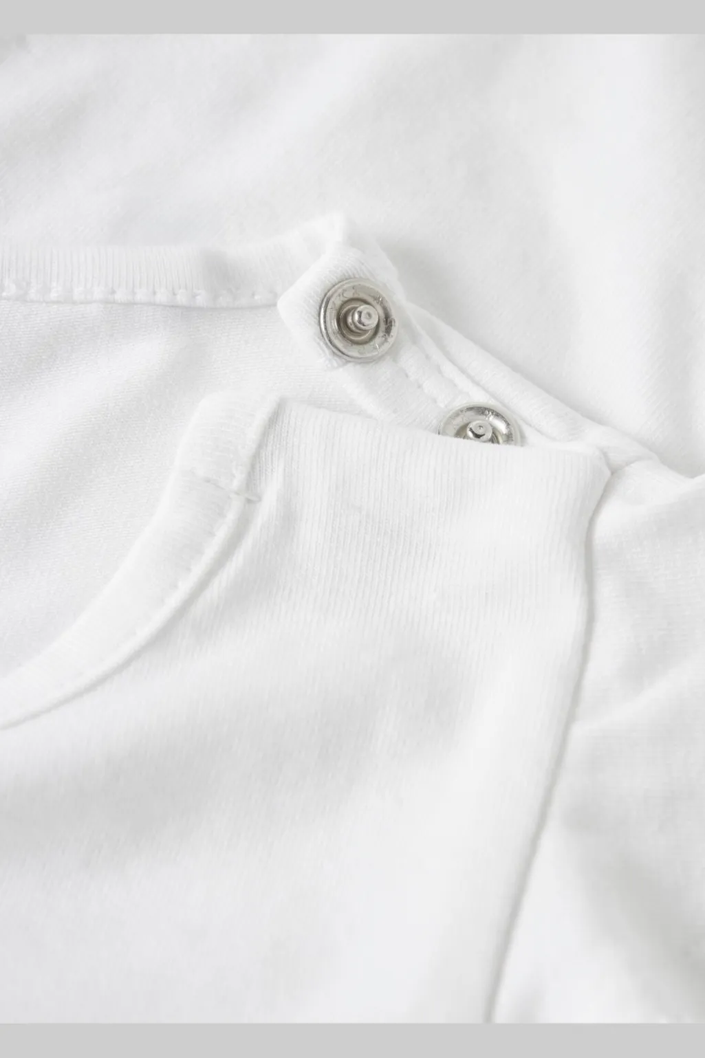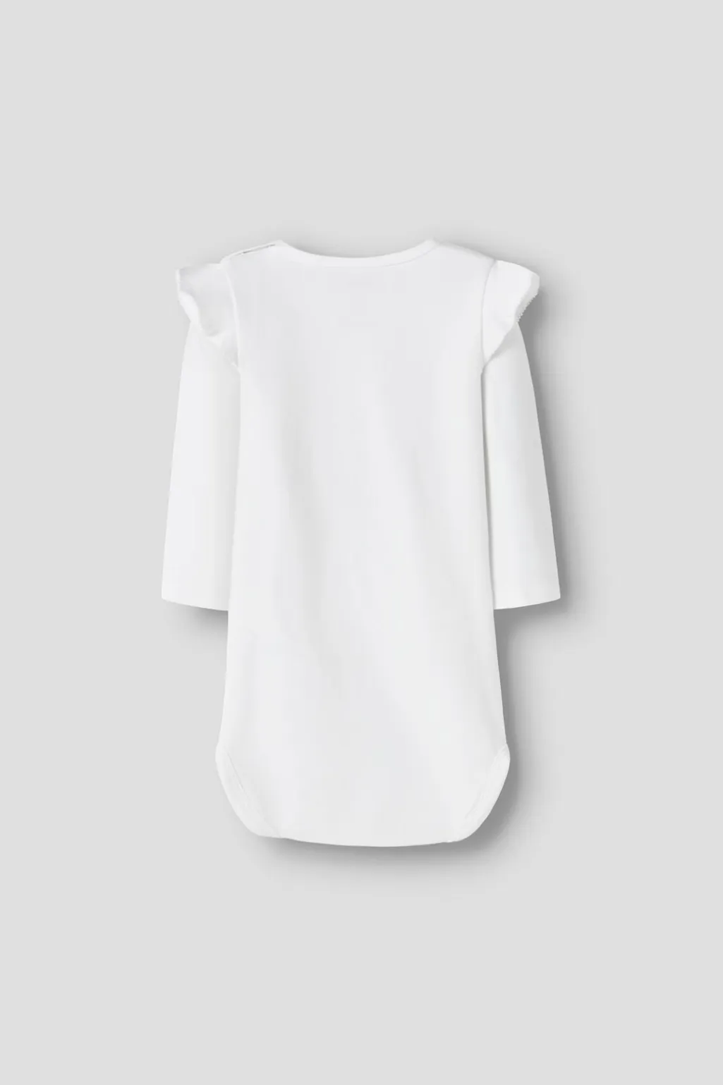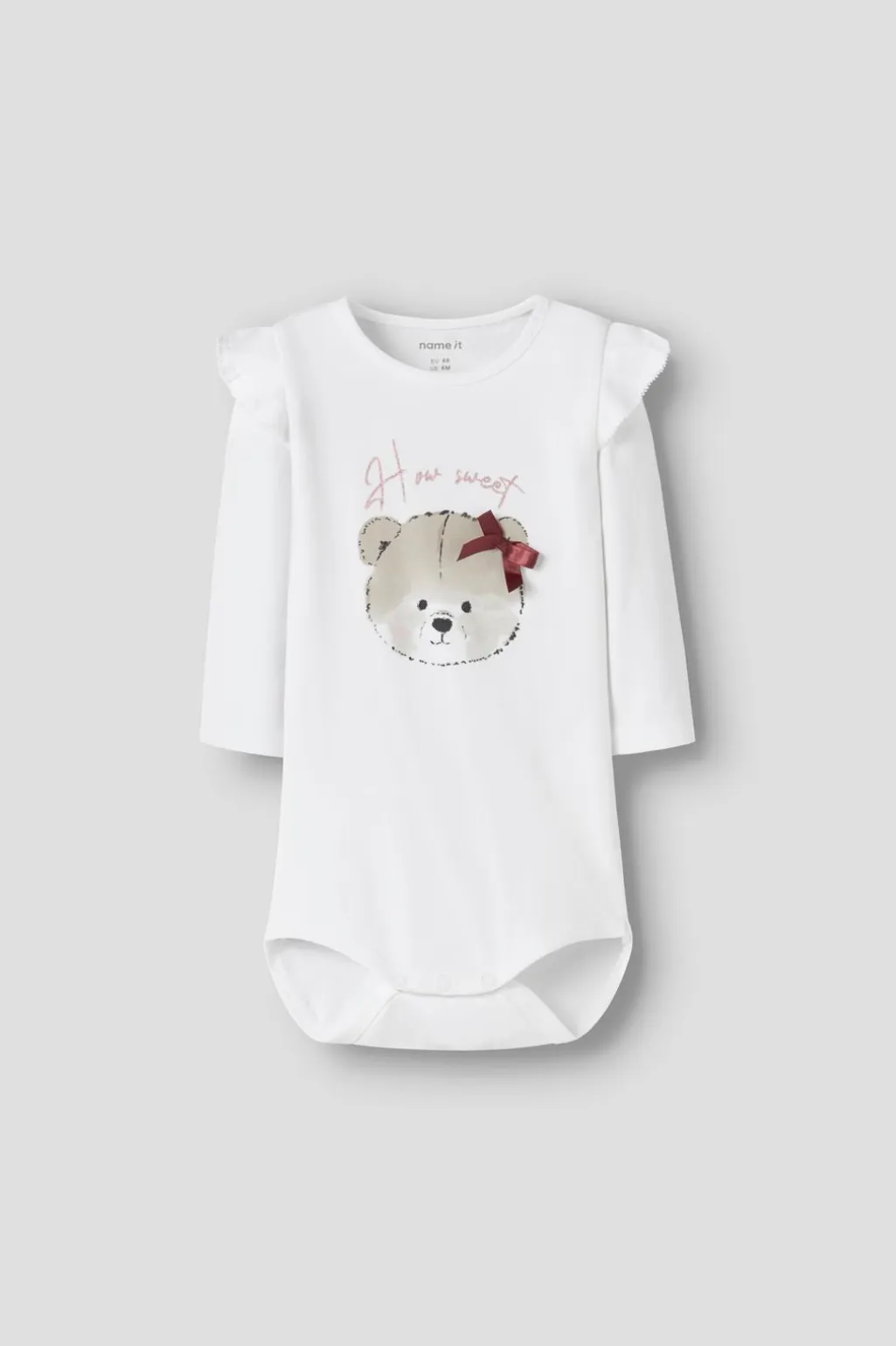 Hvid body fra Name It med lange ærmer og print af et nallehoved med rød sløjfe. Fremstillet i blød jersey med flæsekanter og teksten How sweet over motivet.