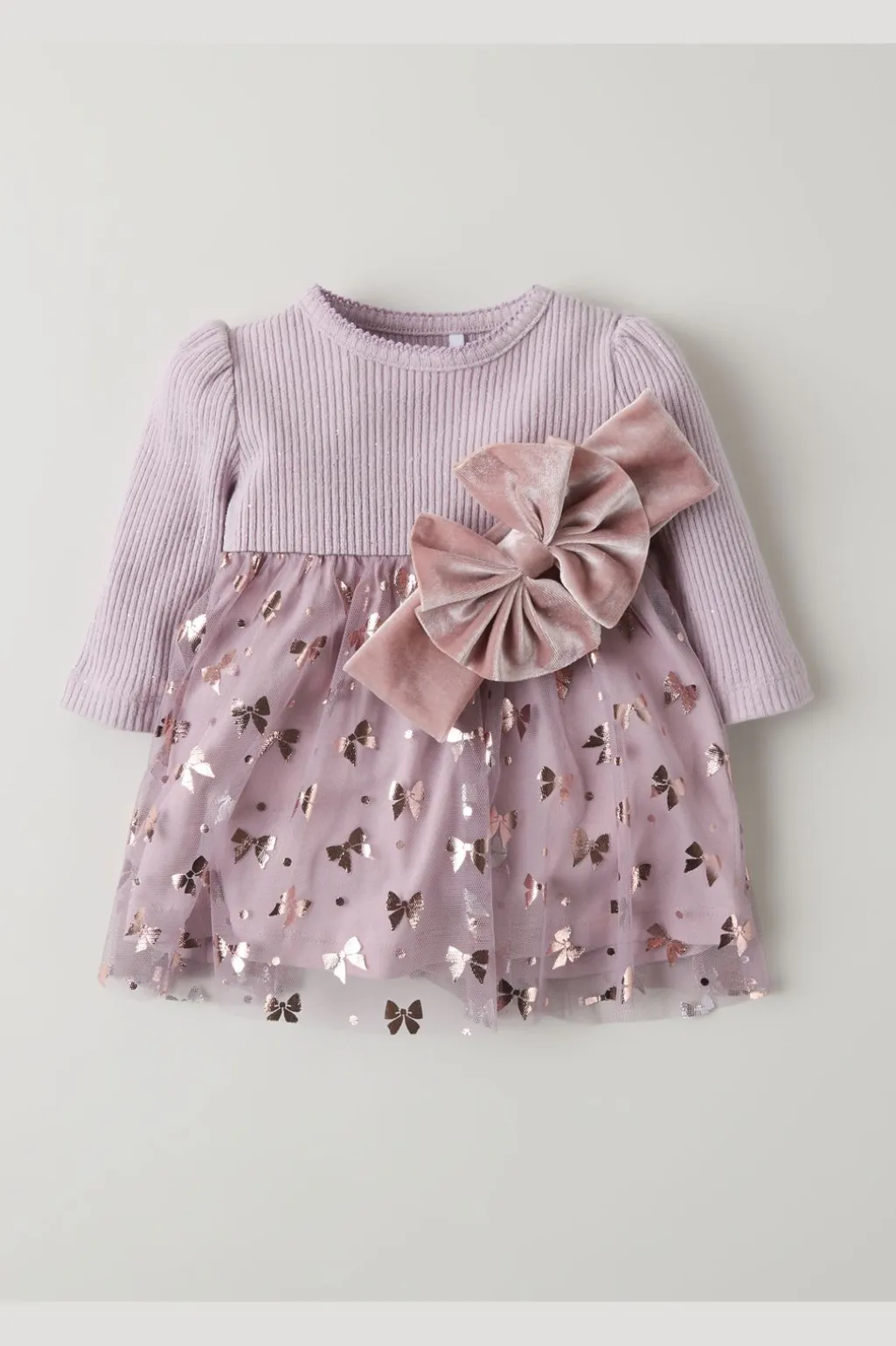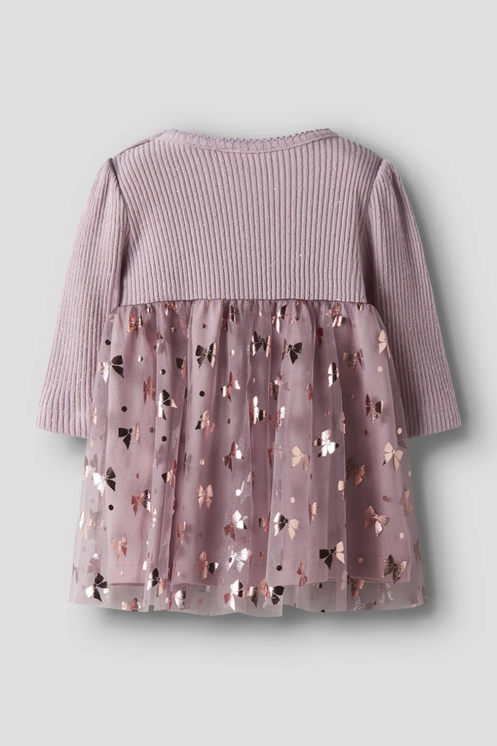 Lys lilla kjole fra Name It med ribstrik og tyl-detaljer. Kjolen har et stribet mønster på overdelen og metalliske sløjfeprint på tylskørtet.