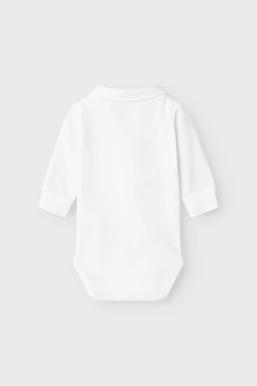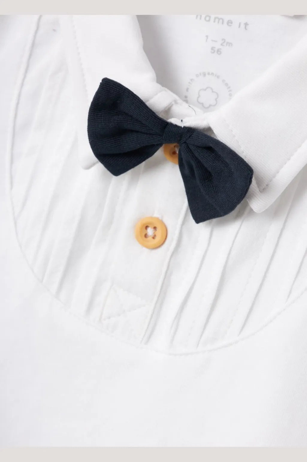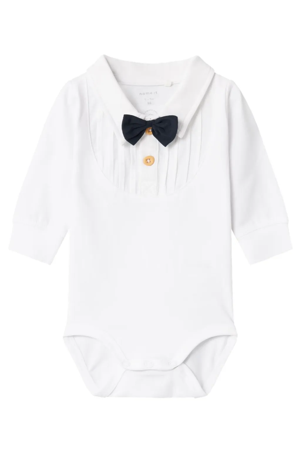 Hvid polobody fra Name It med skjortekrave og sort butterfly. Bodyen har lange ærmer og er fremstillet i en blød og strækbar jersey med plisseret front.
