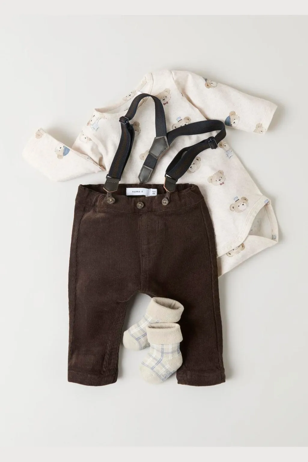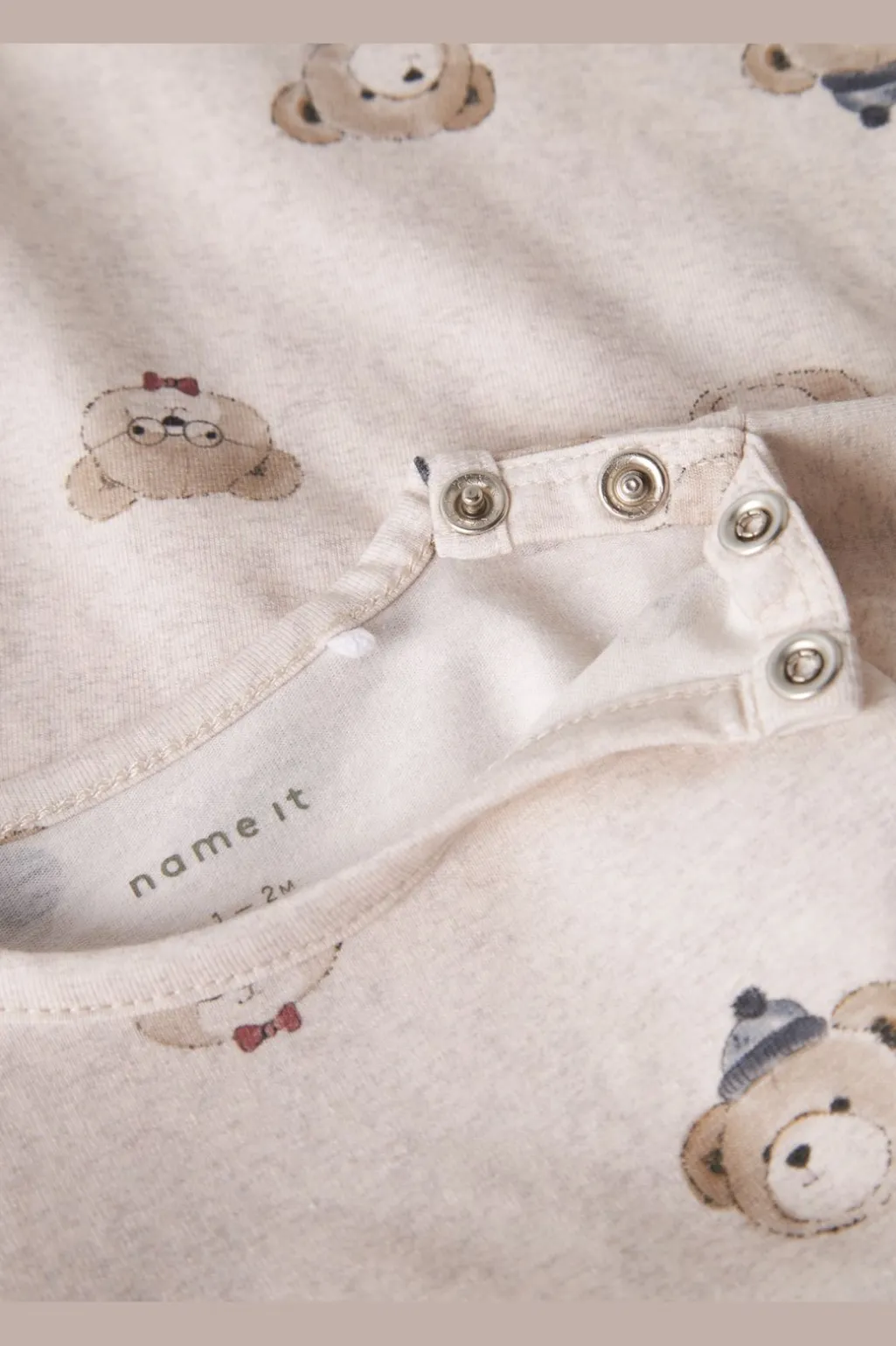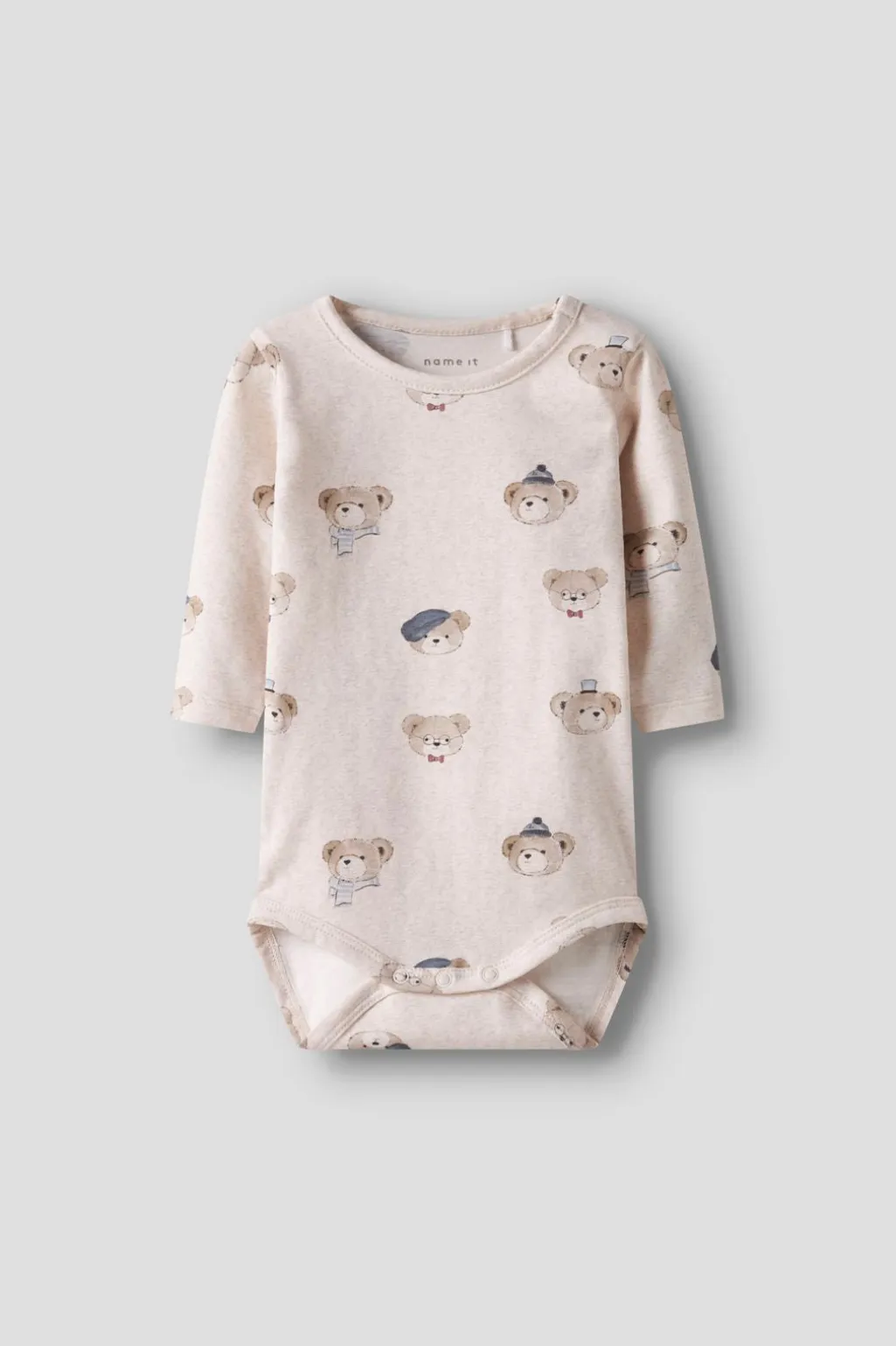 Beige body fra Name It i meleret jersey med søde bjørne med kasketter og butterfly. Den har rund hals og lange ærmer til de kølige dage.