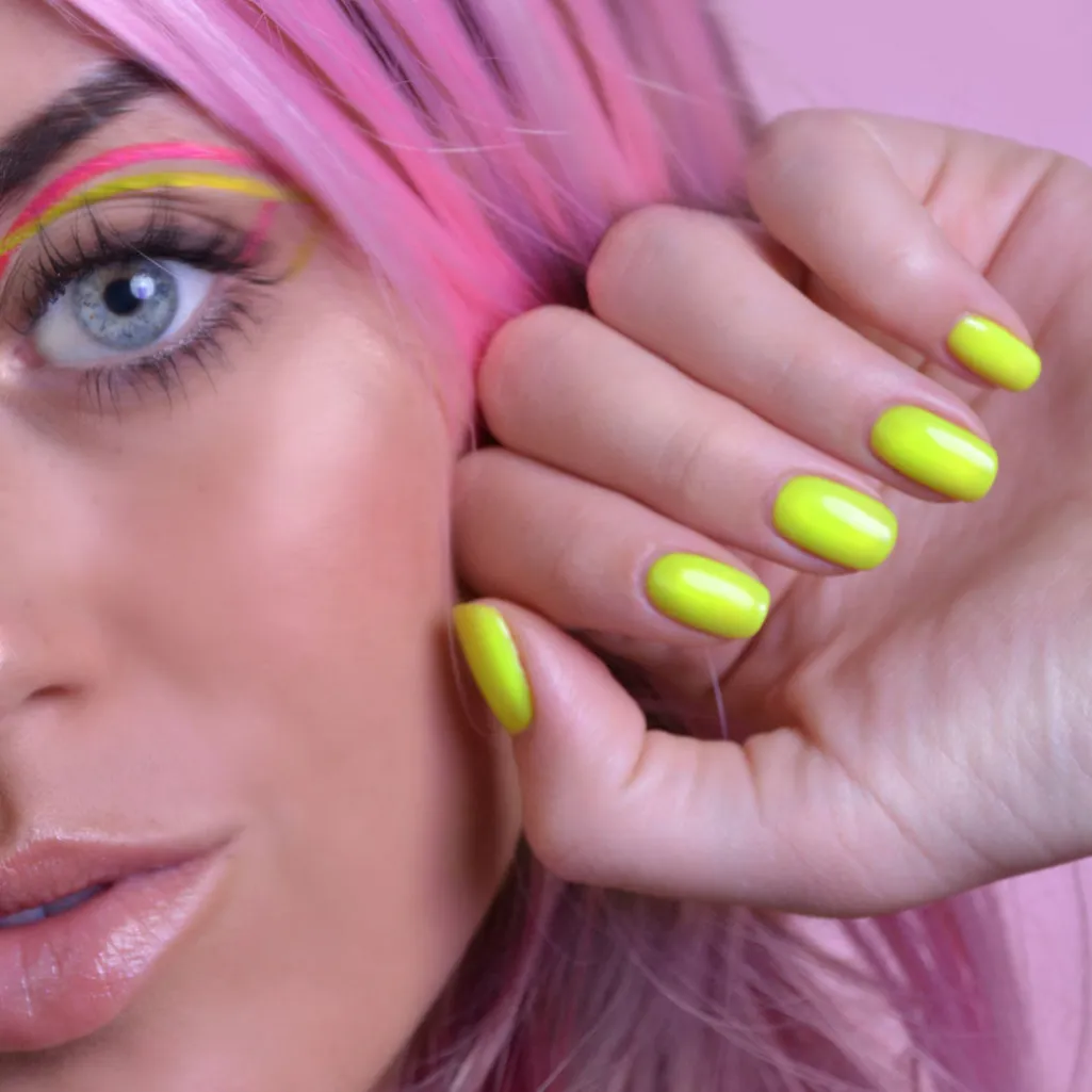 Gelneglelak fra Le Mini Macaron i en neongul farve. Lakken har en 3-i-1 formel med indbygget base coat, farve og top coat.