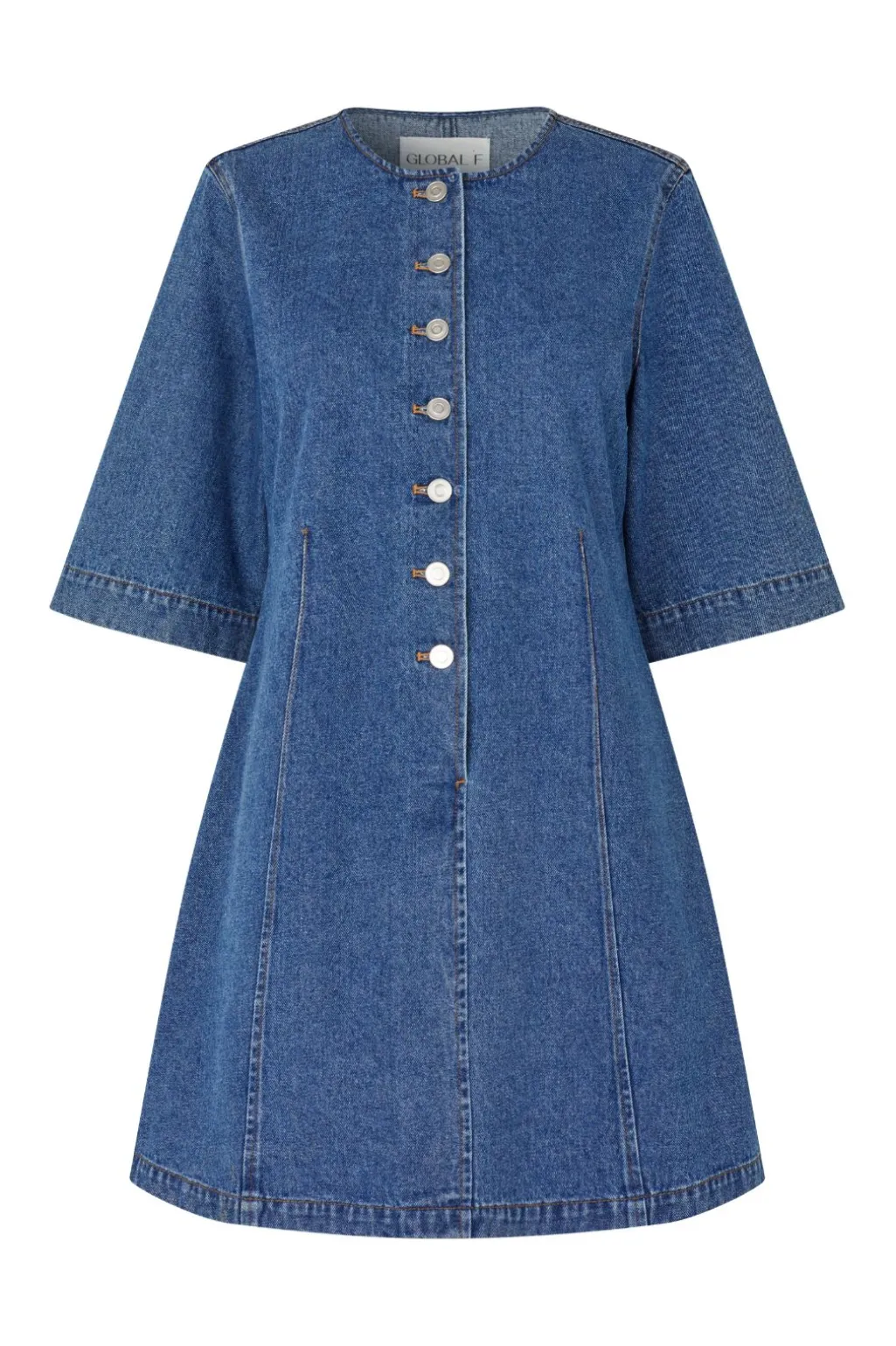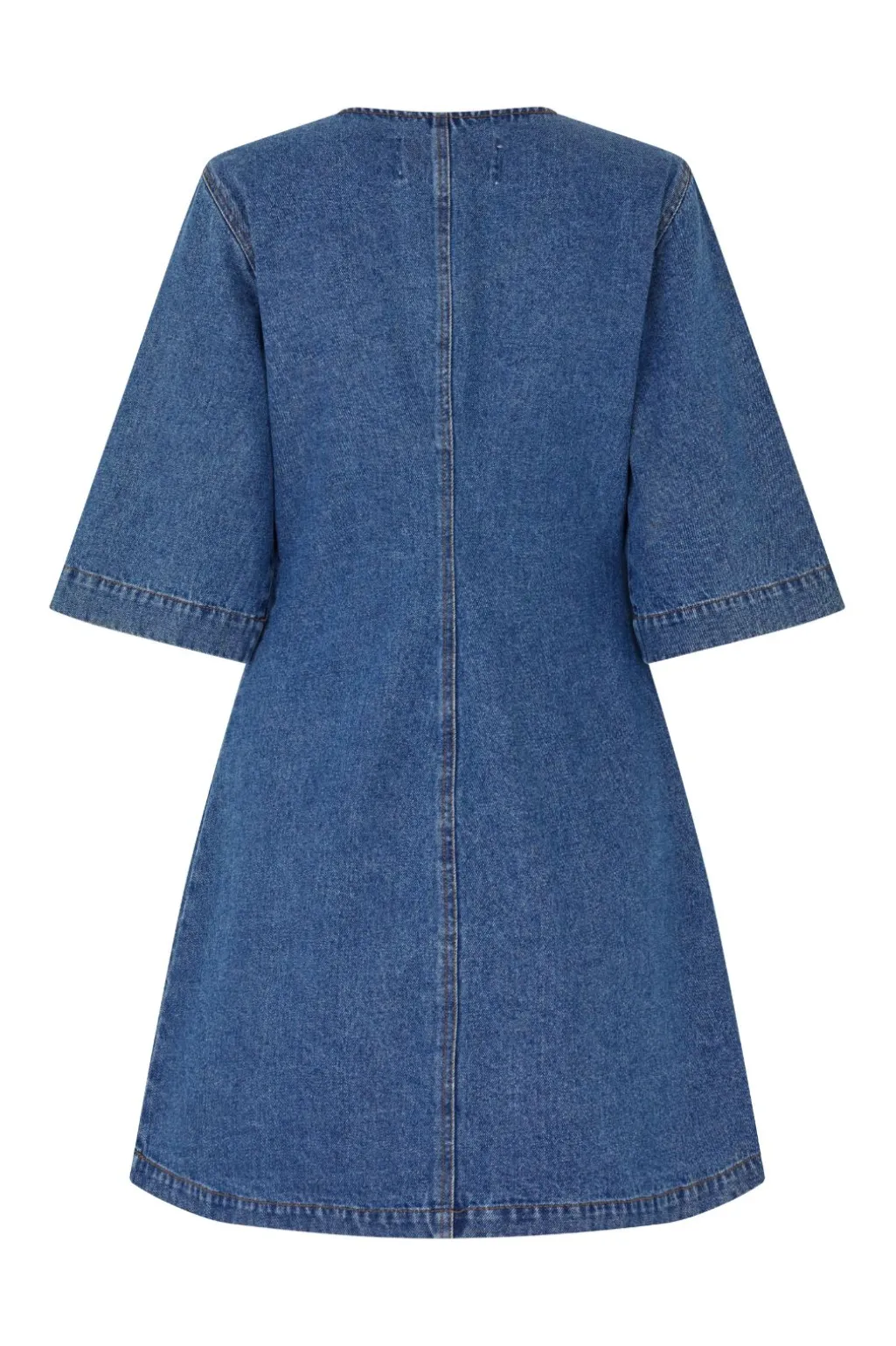 Denimkjole i vintage blå vask med rund halsudskæring. Kjolen har seks knapper foran og trekvartlange ærmer med dekorative syninger langs kanterne.