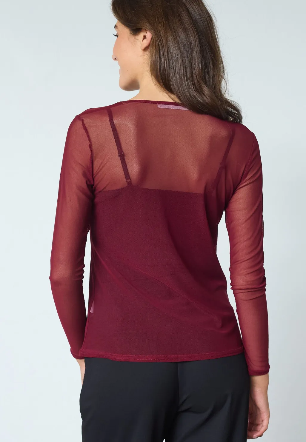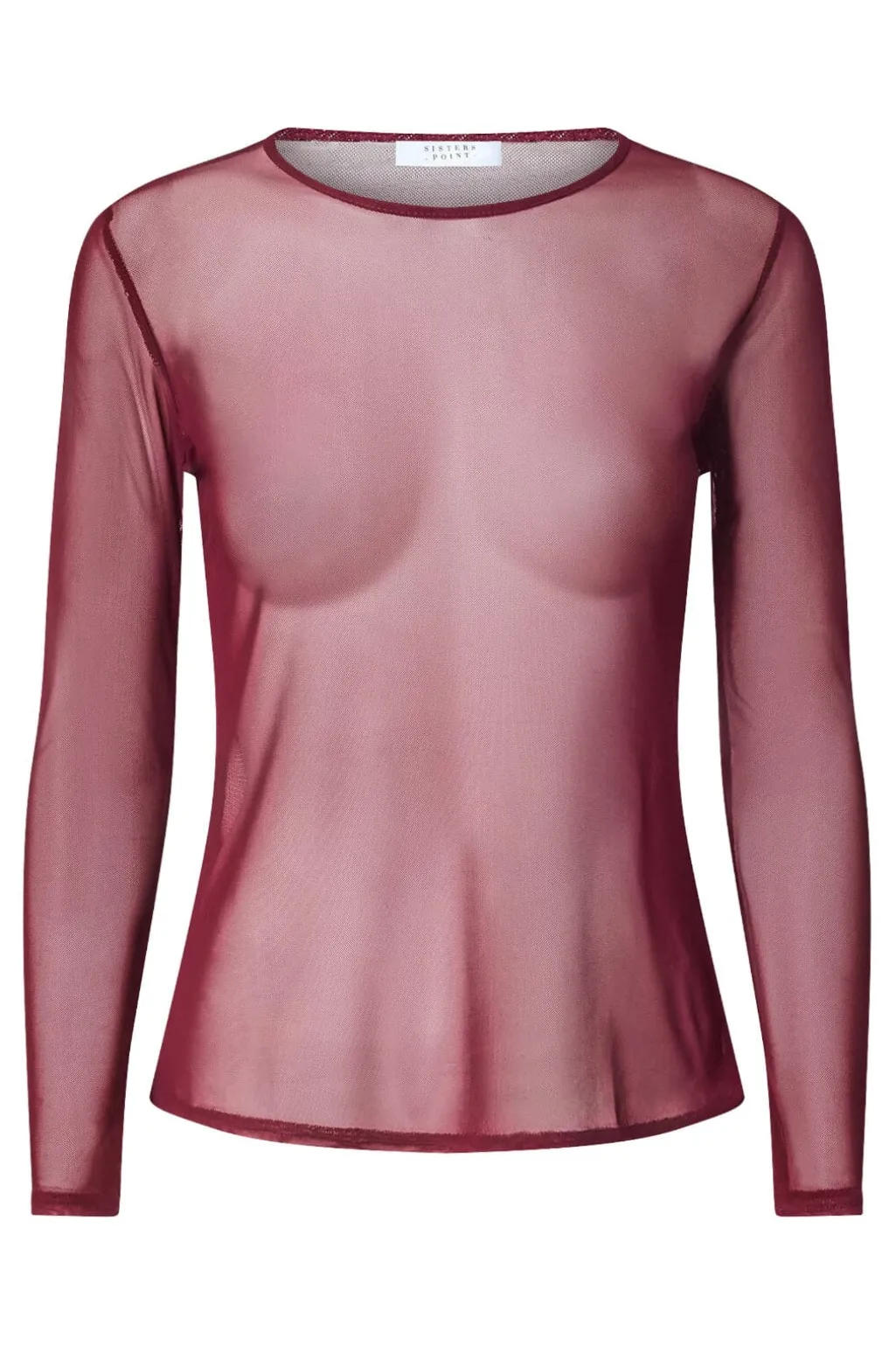 En bordeauxfarvet bluse fra Sisters Point, lavet af transparent mesh. Blusen har lange ærmer og en bådformet halsudskæring med slim fit.