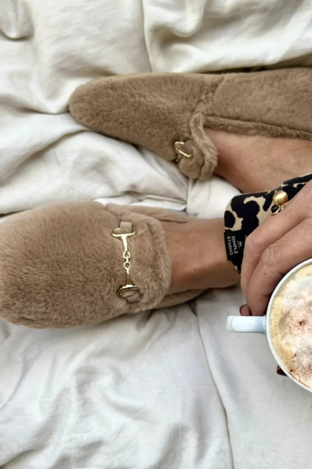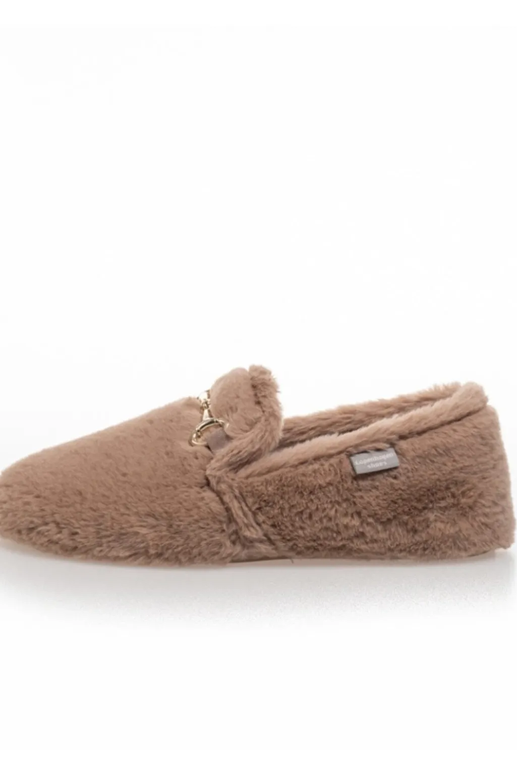 Hjemmesko fra Copenhagen Shoes i taupe med blødt tekstilmateriale. Den har et guldfarvet spænde på oversiden og et lunt foer, der holder fødderne varme.