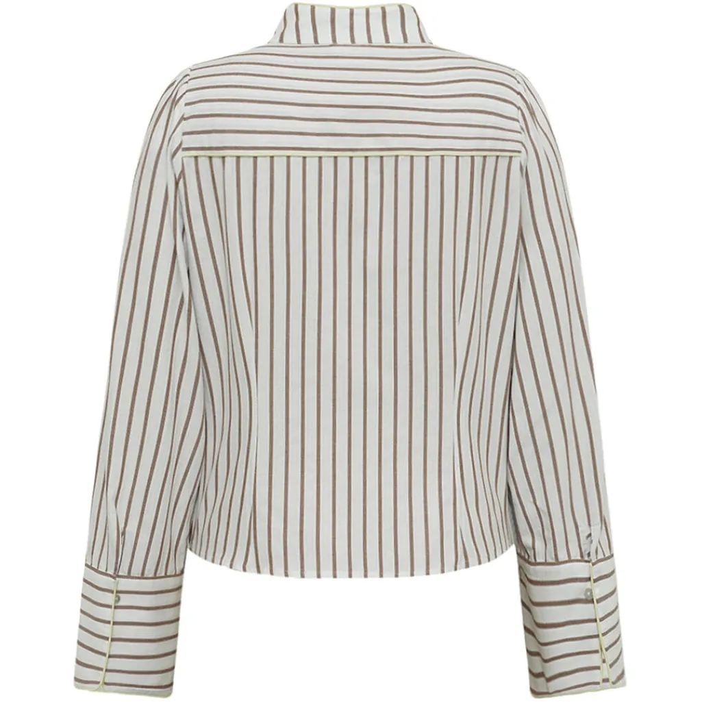 Stribet skjorte fra Gossia med off-white bundfarve og brune striber. Den har høj hals og lynlåslukning foran samt lange ærmer med manchetter.