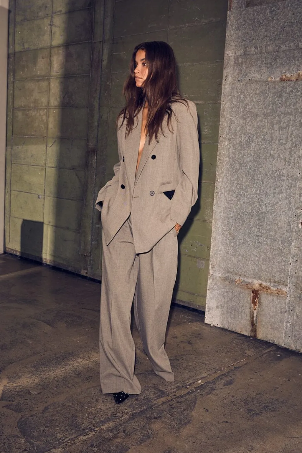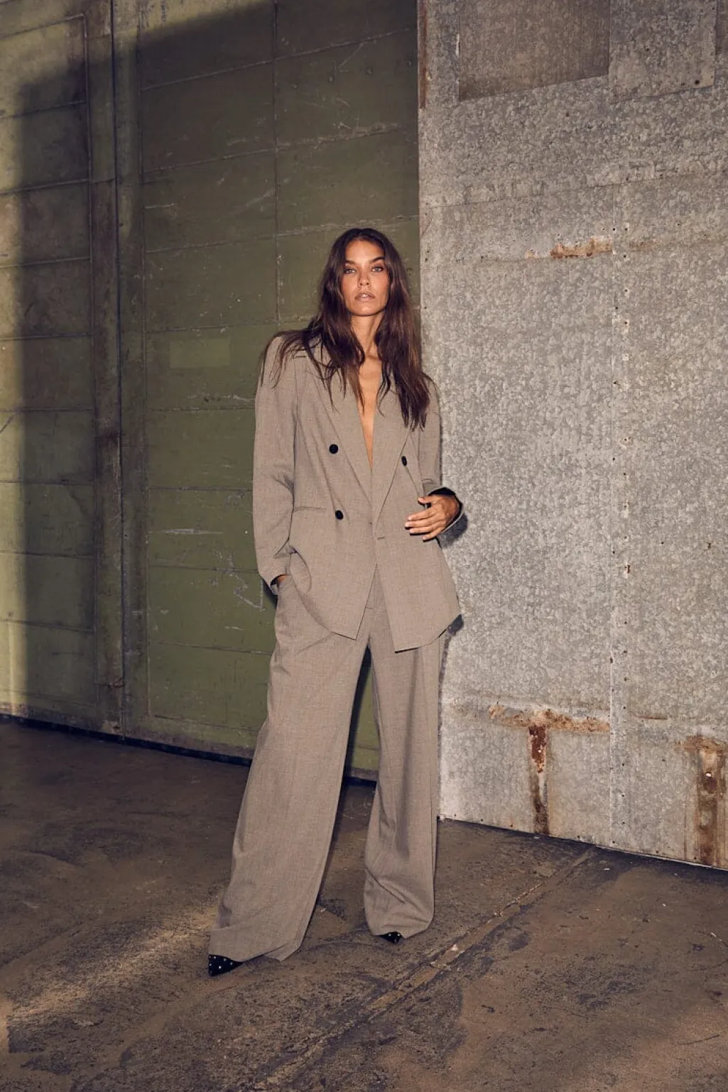 Blazer fra Haute L’Amitié i beige melangé med dobbeltknappet design og sorte knapper. Blazeren har brede revers og en oversized pasform.