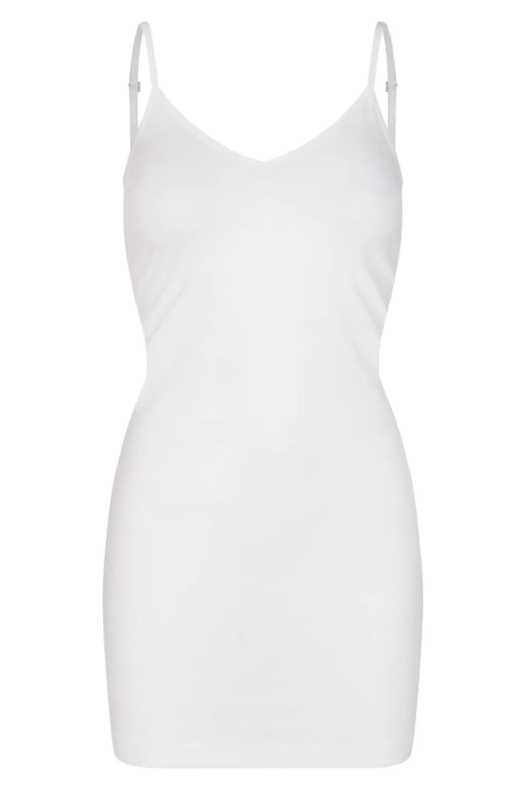 Hvid slipdress fra Liberte med tynde spaghetti-stropper og v-udskæring. Kjolen har en tætsiddende silhuet og går til låret.