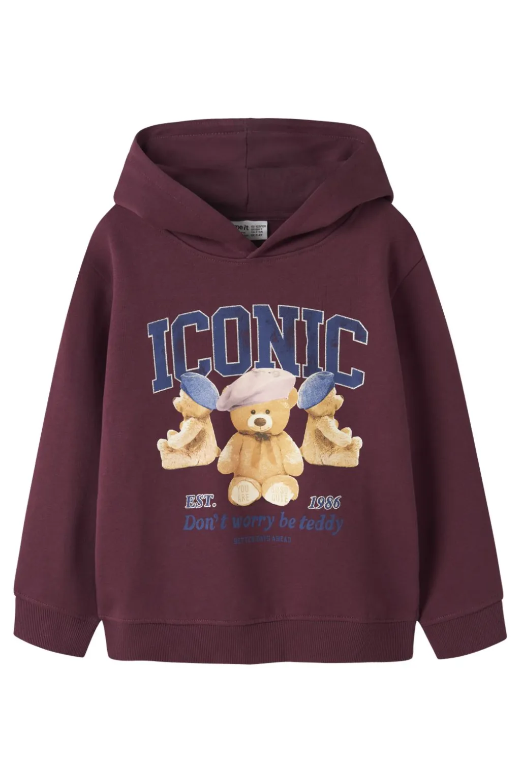 Bordeaux sweatshirt fra Name It med hætte og fotoprint på forsiden. Den børstede kvalitet med blød inderside giver en behagelig fornemmelse mod huden, mens det grafiske print med bamse og tekst tilføjer et legende udtryk.