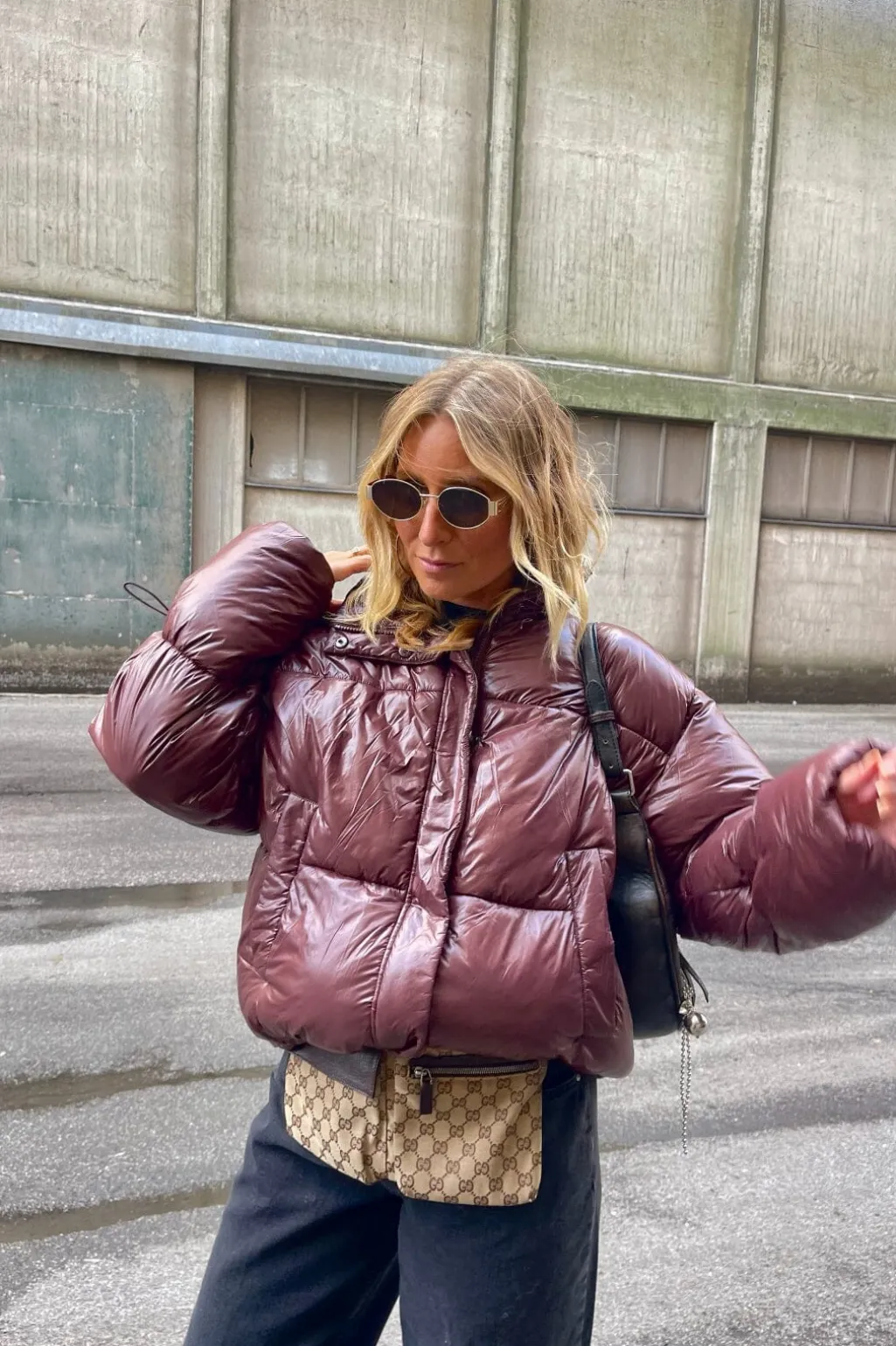 Pufferjakke fra Noisy May i en mørk rødbrun nuance. Jakken er lavet af 100 % nylon med en skinnende overflade og store polstrede sektioner.