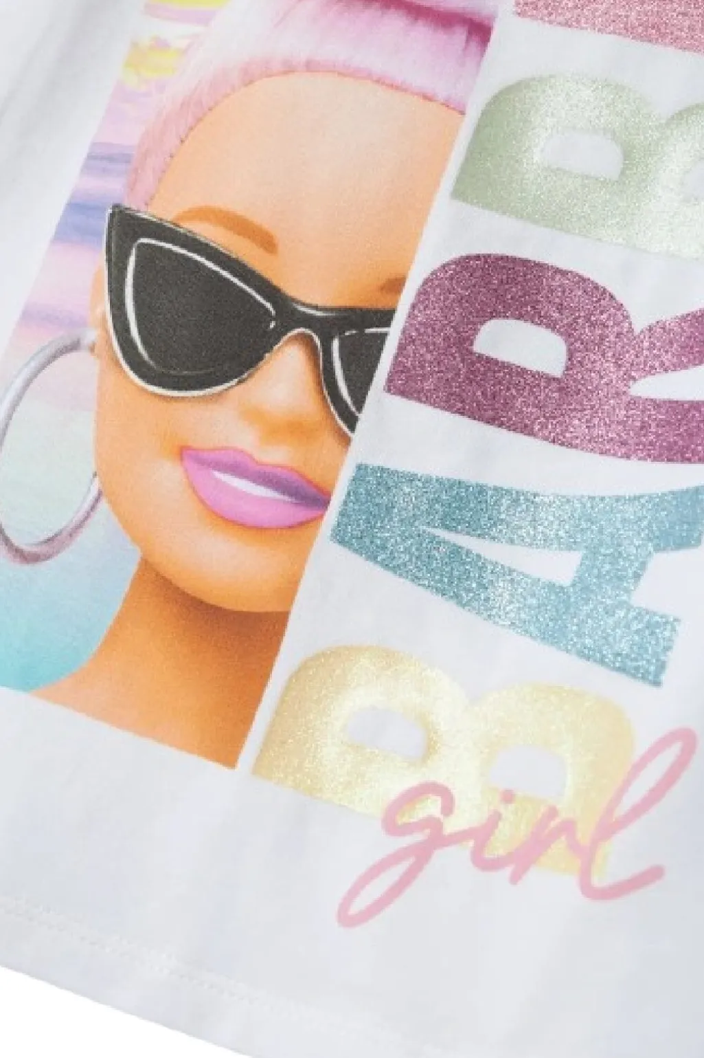 Det farverige print har glitrende effekter i forskellige nuancer. Designet viser en Barbie-figur med pink hår og solbriller.