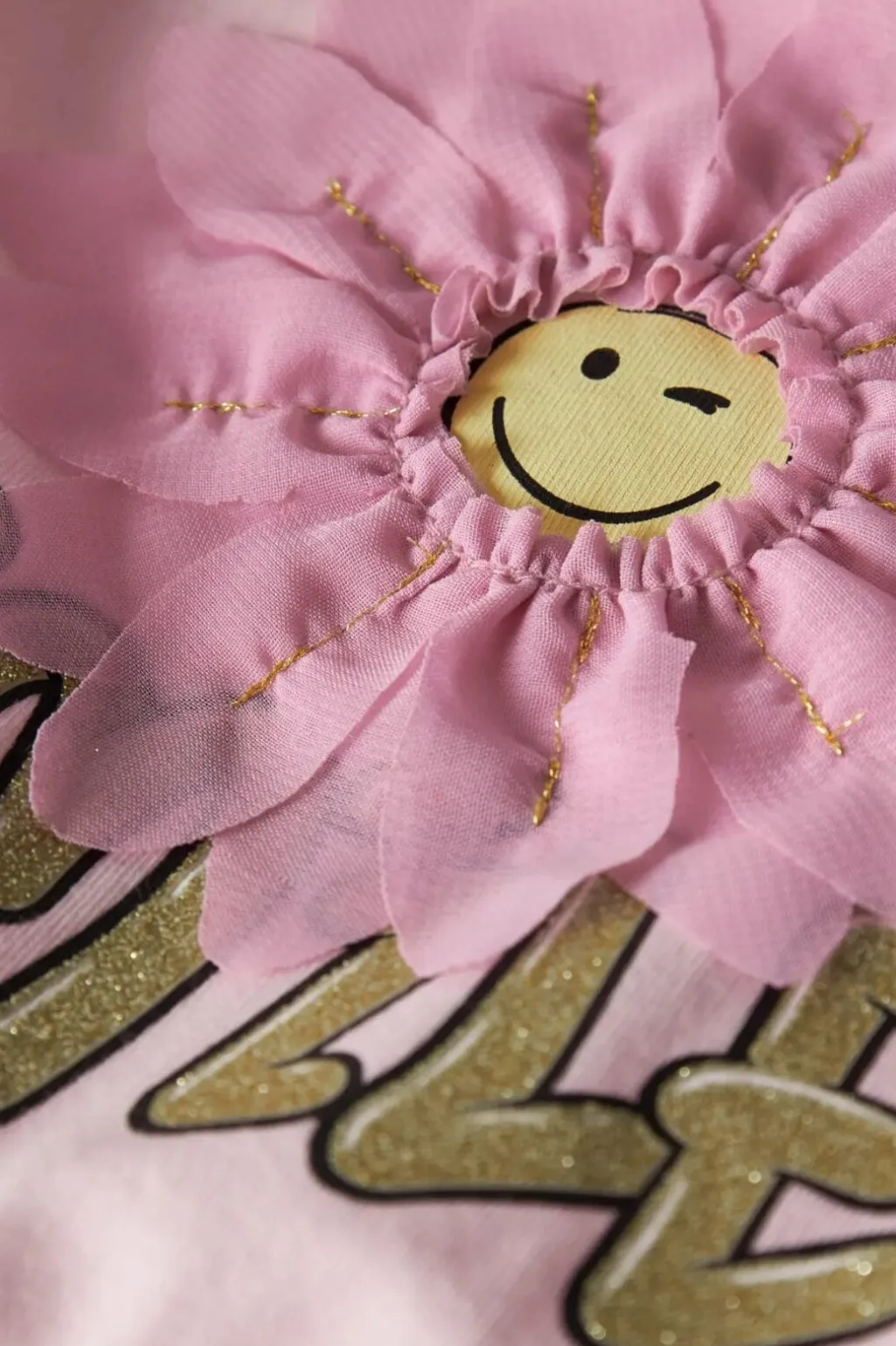 Kjole fra Name It med tylskørt. Den lyserøde overdel har flæser ved ærmerne, og en stor blomst med smiley pryder forsiden. Et glimrende bånd markerer taljen.