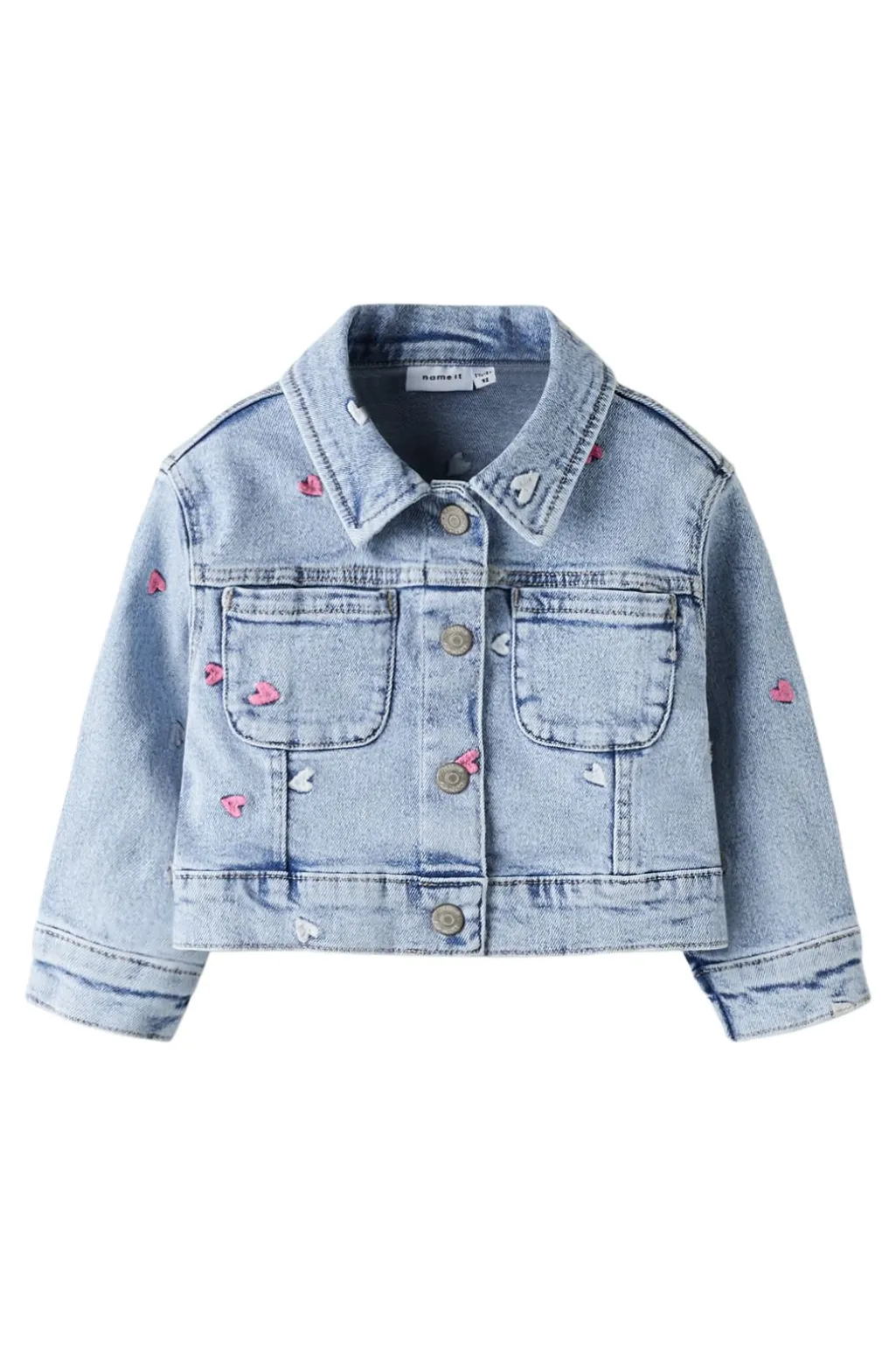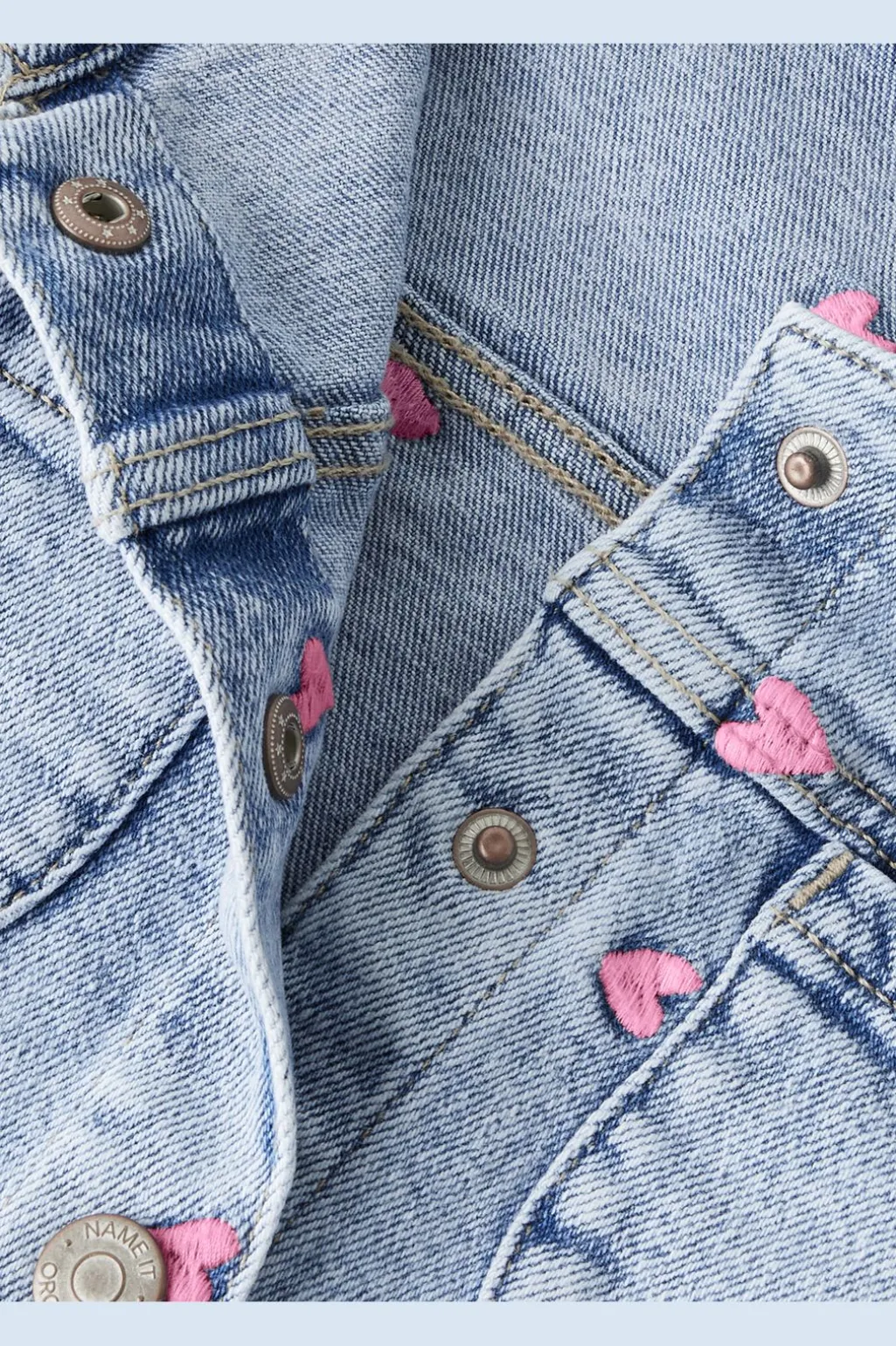 Sammensæt det perfekte outfit til dit barn med hverdagsstyles i høj kvalitet og skønne designs.Denim er en slidstærk, vævet kvalitet, som findes i et utal af udtryk og nuancer.- Produkttype: Denimjakke – Hals: Spredt krave – Lukning: Trykknaplukning – Lommer: Brystlommer – Detaljer: Broderet detalje – Vask/behandling: Kraftig slideffekt på overfladen
