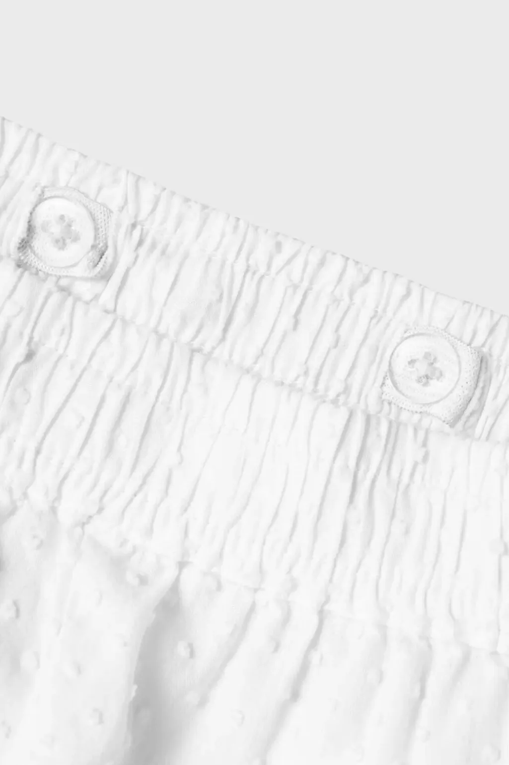 Hvid nederdel fra Name It med let tekstur på stoffet. Designet har flere lag flæser og en elastisk talje, der giver god bevægelsesfrihed.