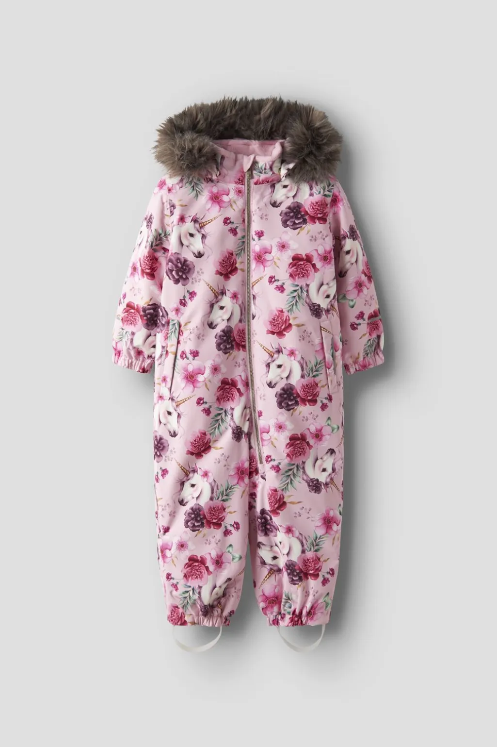 Lyserød flyverdragt fra Name It med blomster- og enhjørningsmønster. Dragten har en høj hals, lynlås og trykknapper samt hætte med pelskant.