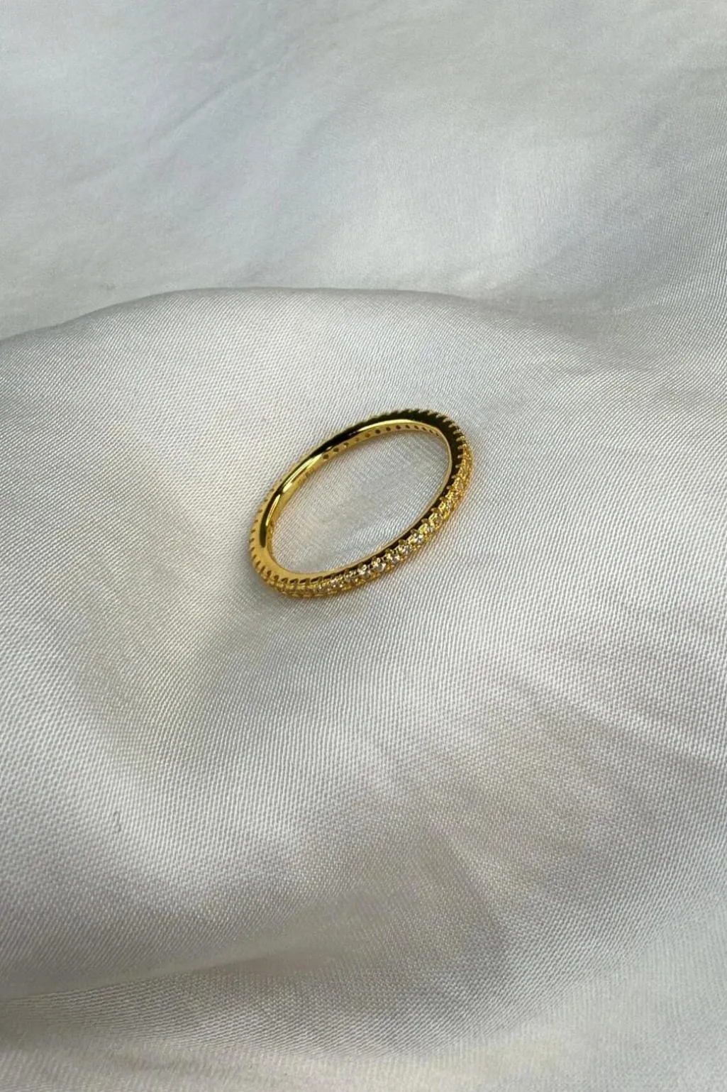En guldfarvet ring fra Molly&My Jewellery, lavet af rustfrit stål. Ringen har små sten indsat rundt om hele omkredsen og en glat indre overflade.