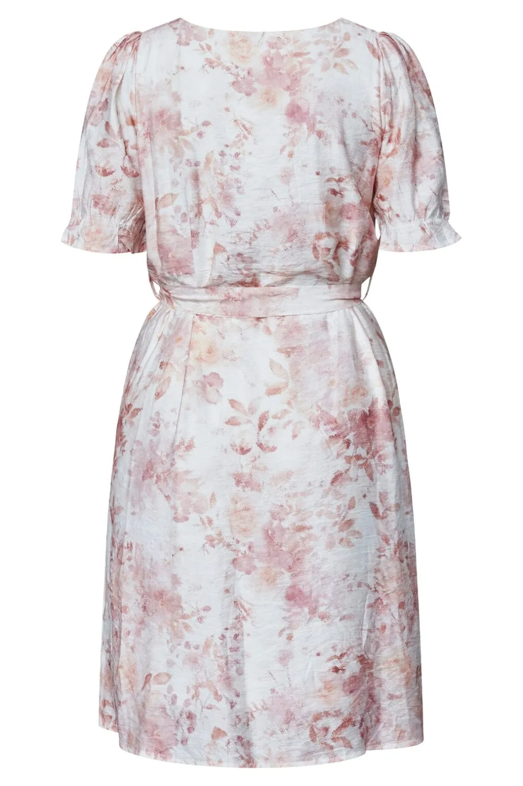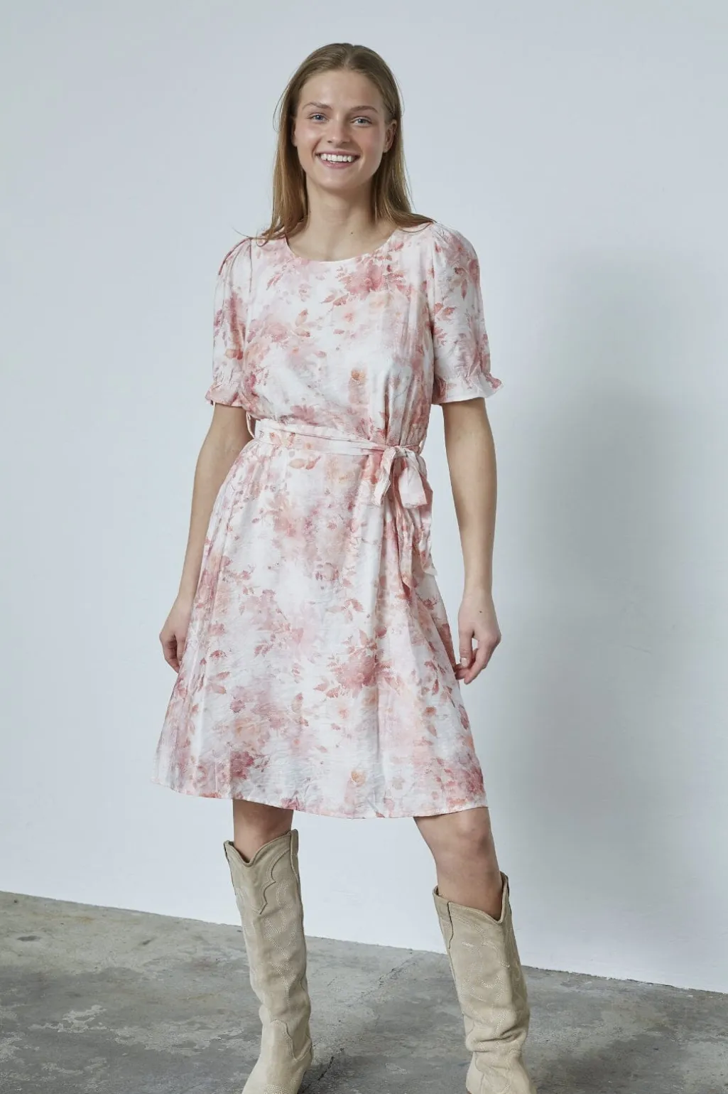 Knælang kjole fra Sisters Point i hvid med lyse koralblomster. Kjolen har puffede ærmer og rund halsudskæring samt et bindebånd i taljen, der kan justeres.