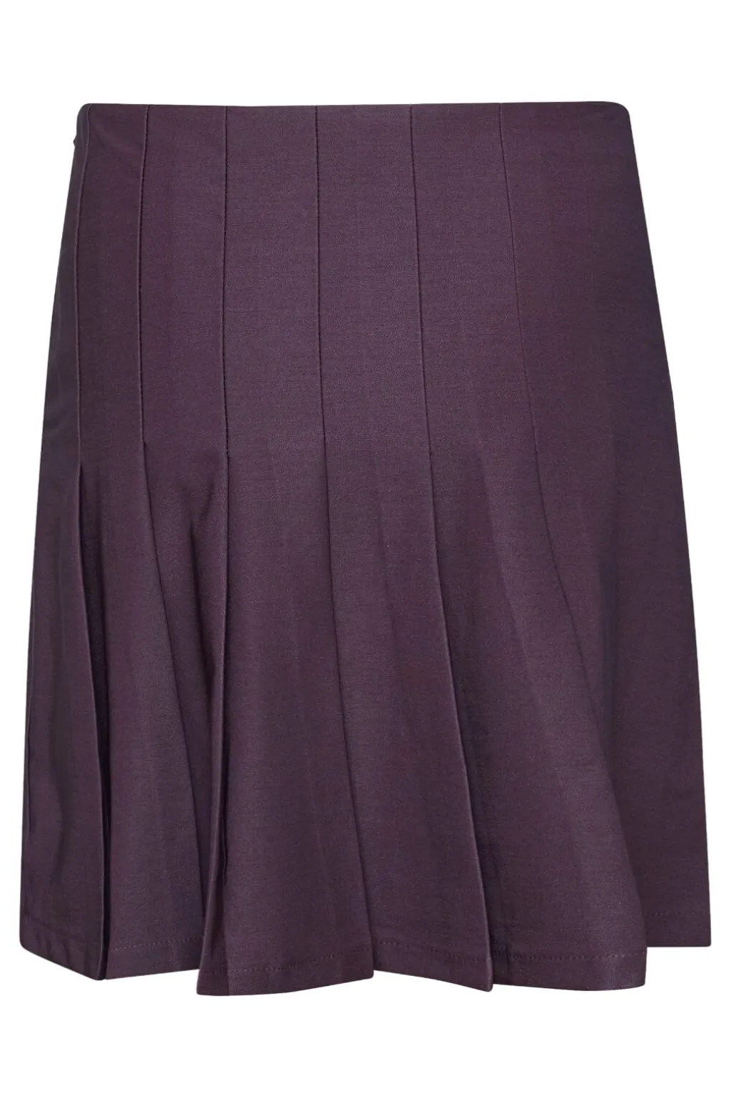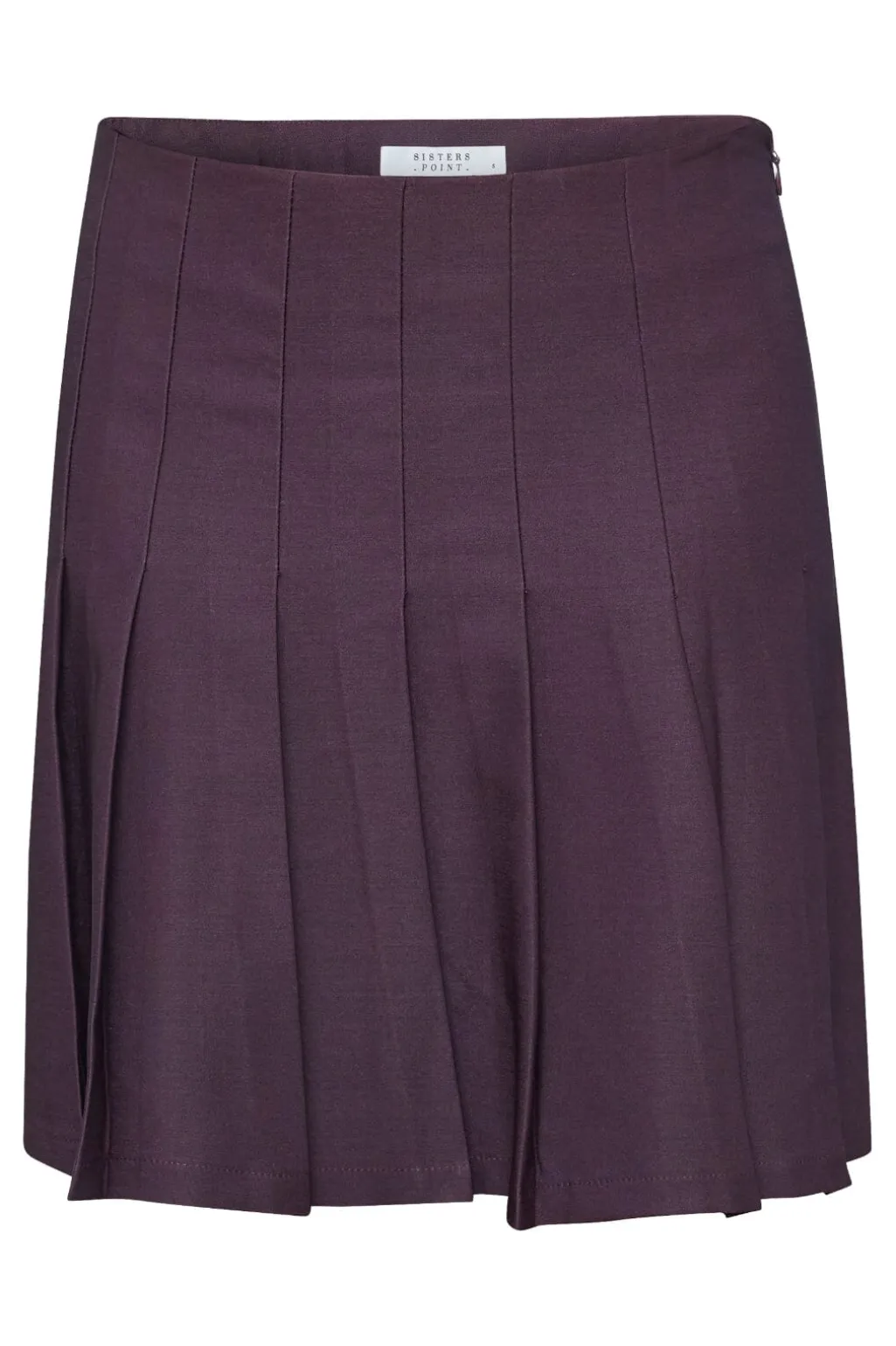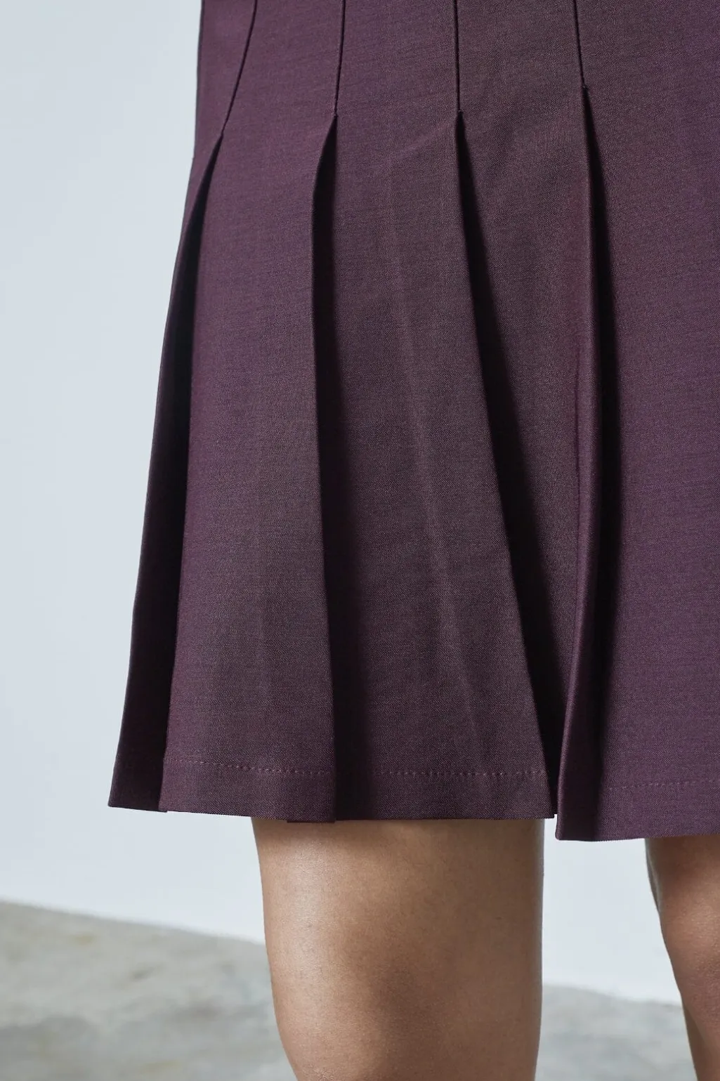 Plisseret nederdel fra Sisters Point i dyb bordeaux. Den korte nederdel har en bred linning i taljen og plisseringer, der skaber bevægelse.