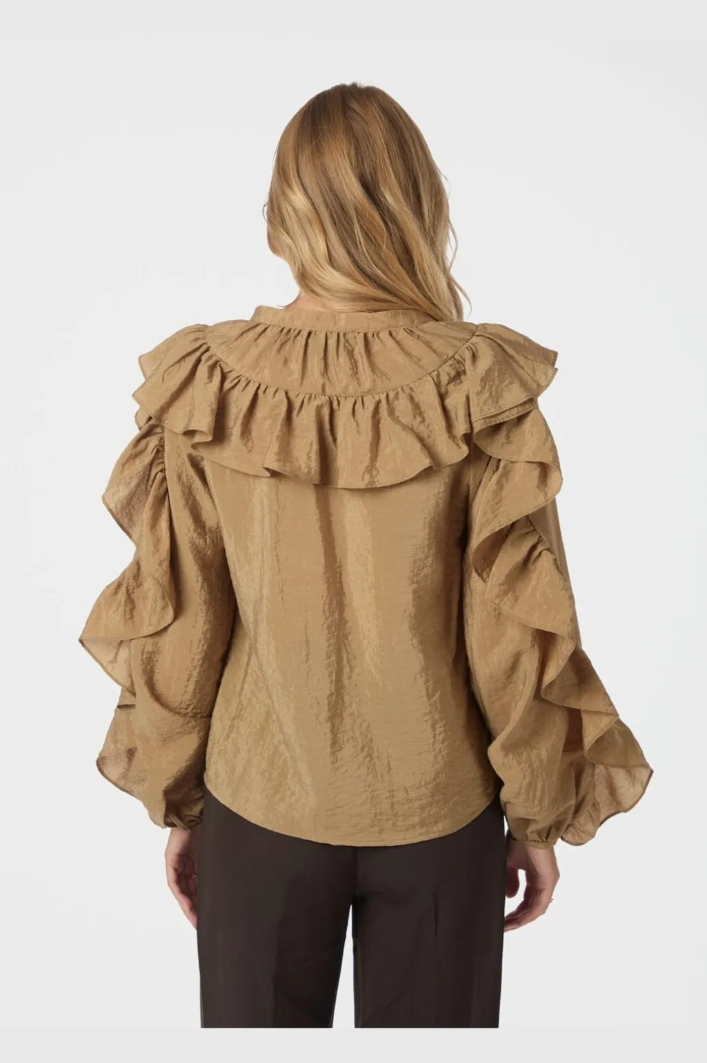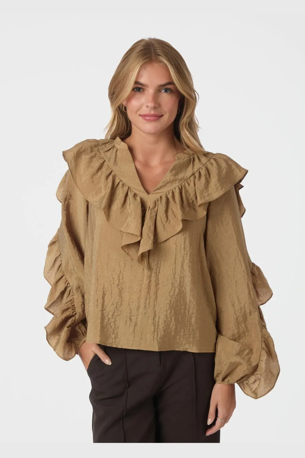 Sandfarvet bluse fra Neo Noir med flæsedetaljer. Blusen har en løs pasform og V-hals med flæsekant. De lange ærmer har voluminøse flæser langs siderne.