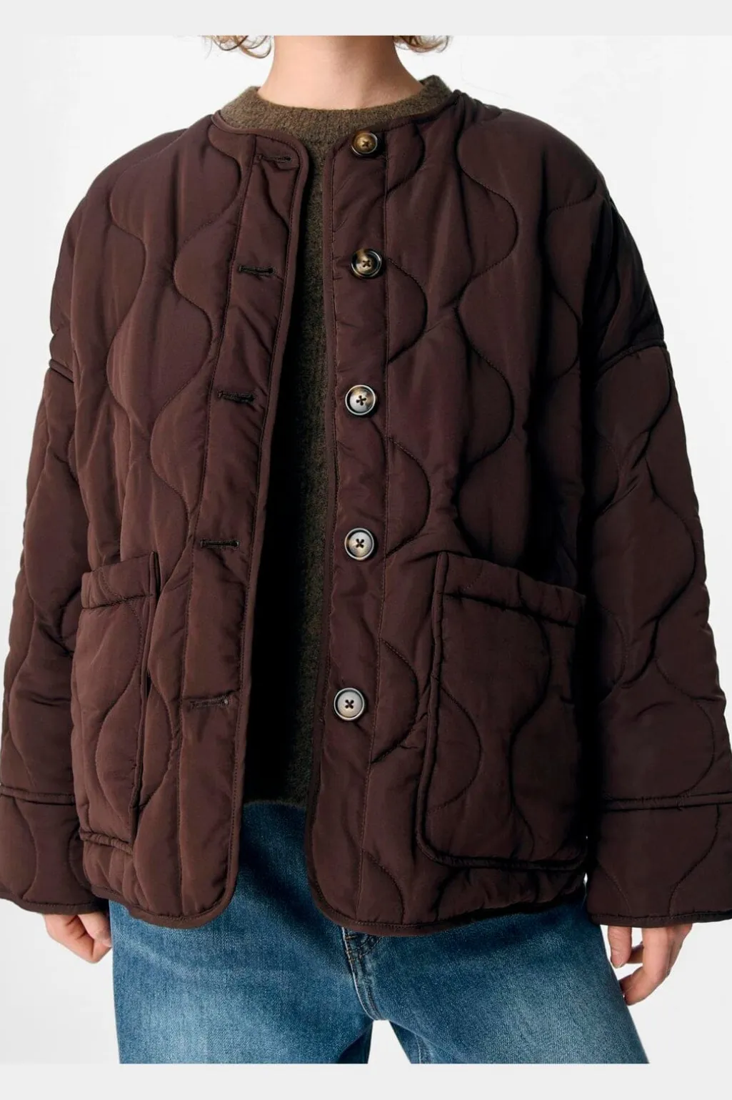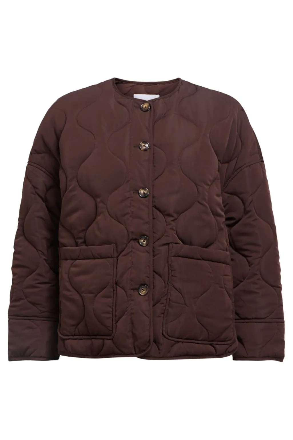 Brun quiltet jakke fra Object med rund hals og lange ærmer. Den har knaplukning foran og praktiske forlommer. Jakken er fremstillet af vatteret stof med et gennemgående syet mønster.