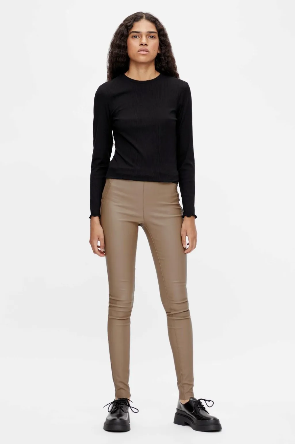 Brune leggings fra Object med en skinnende, coated overflade. Leggingsene har en tætsiddende pasform og lynlås i siden.