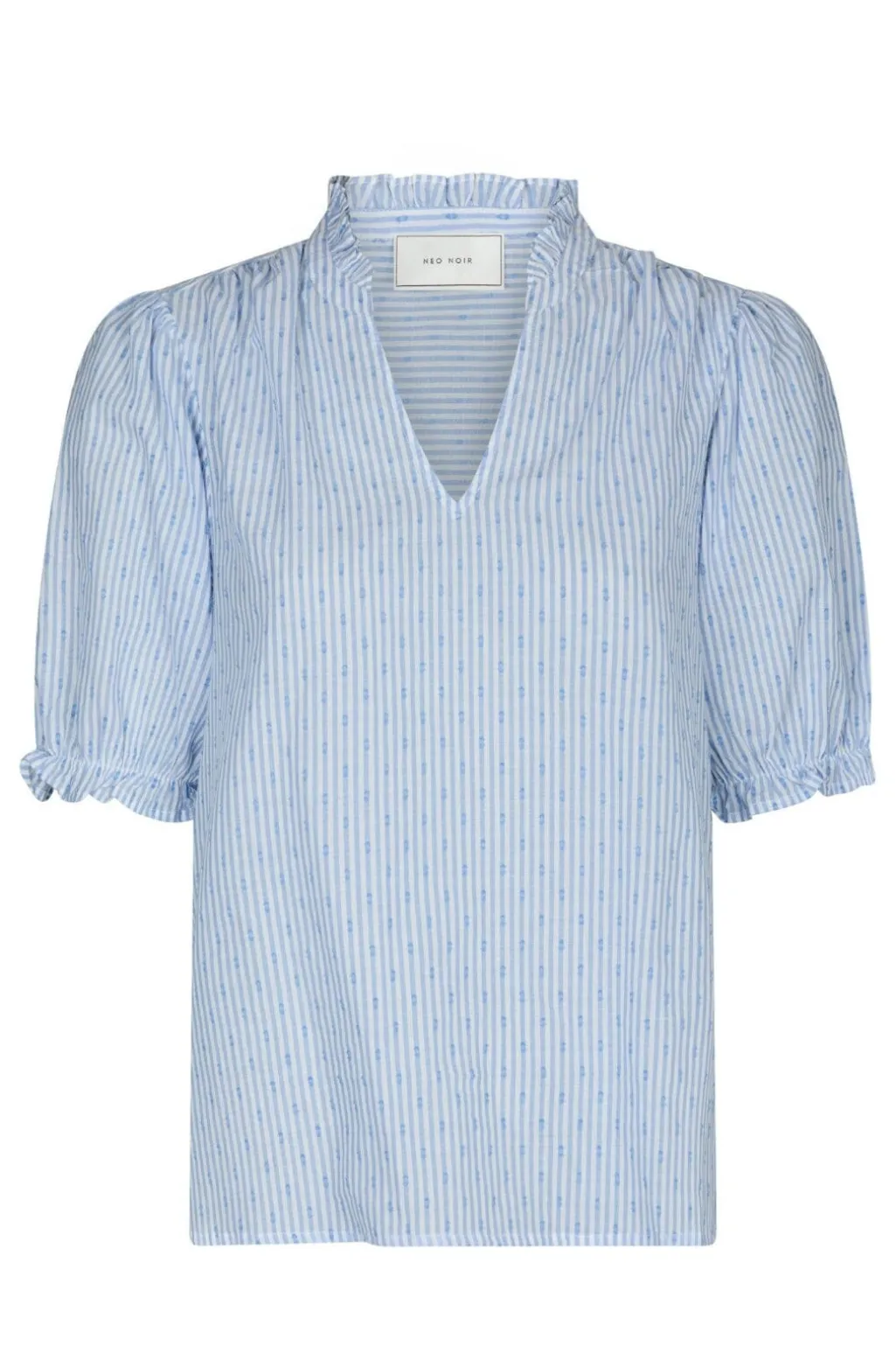 Lyseblå bluse fra Neo Noir med striber og prikker. Blusen har flæsedetaljer ved kraven og skuldrene samt korte pufærmer. V-udskæring og normal pasform.