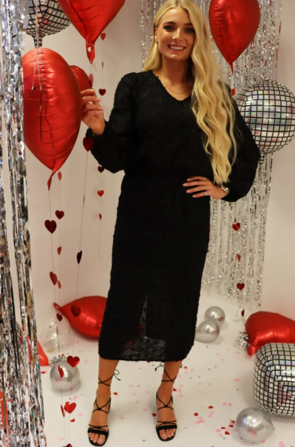 Sort bluse fra Liberte med lange ærmer og V-halsudskæring. Den har en let gennemsigtig overflade med vertikale linjer, der giver blusen struktur og dybde.