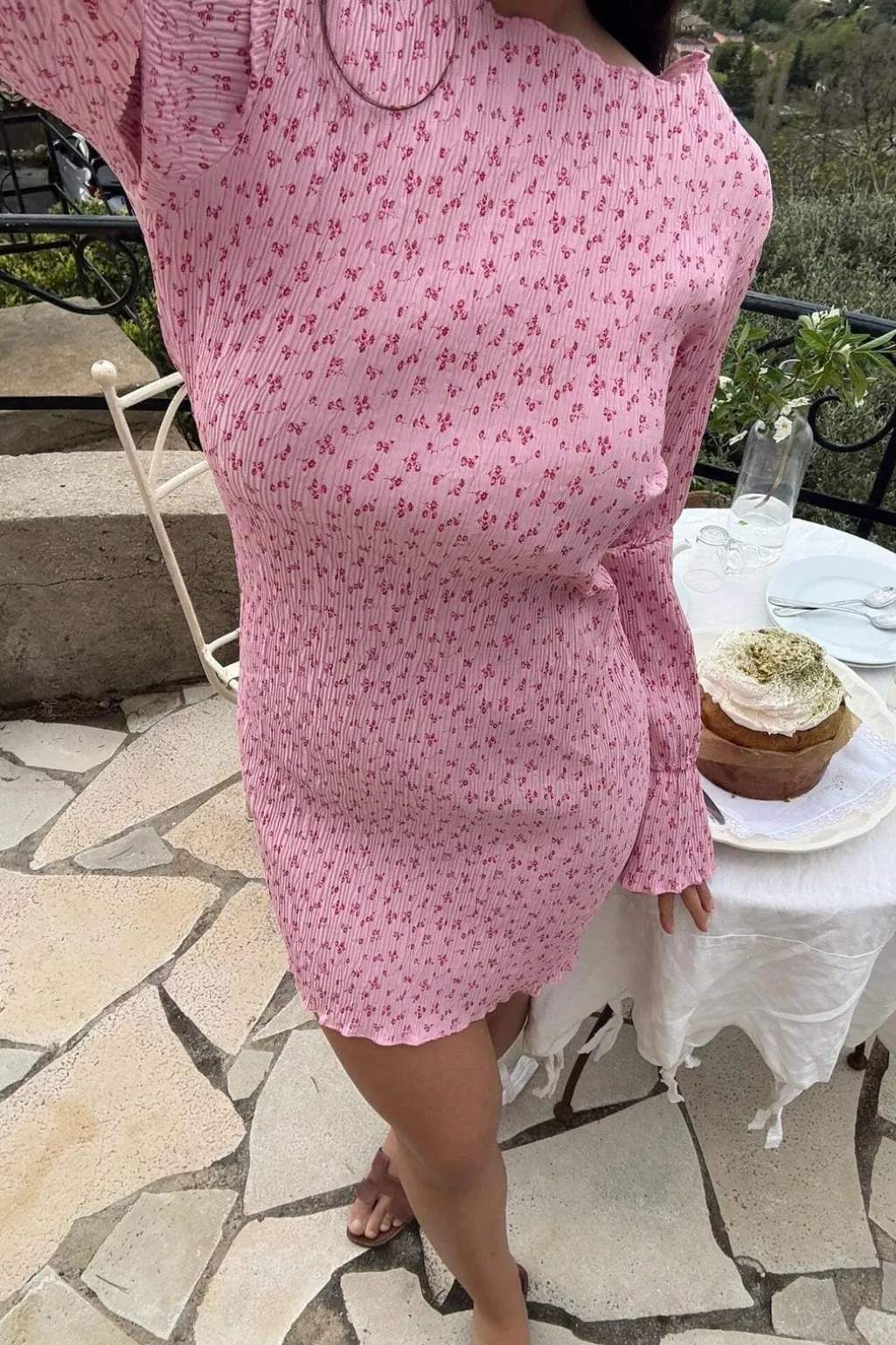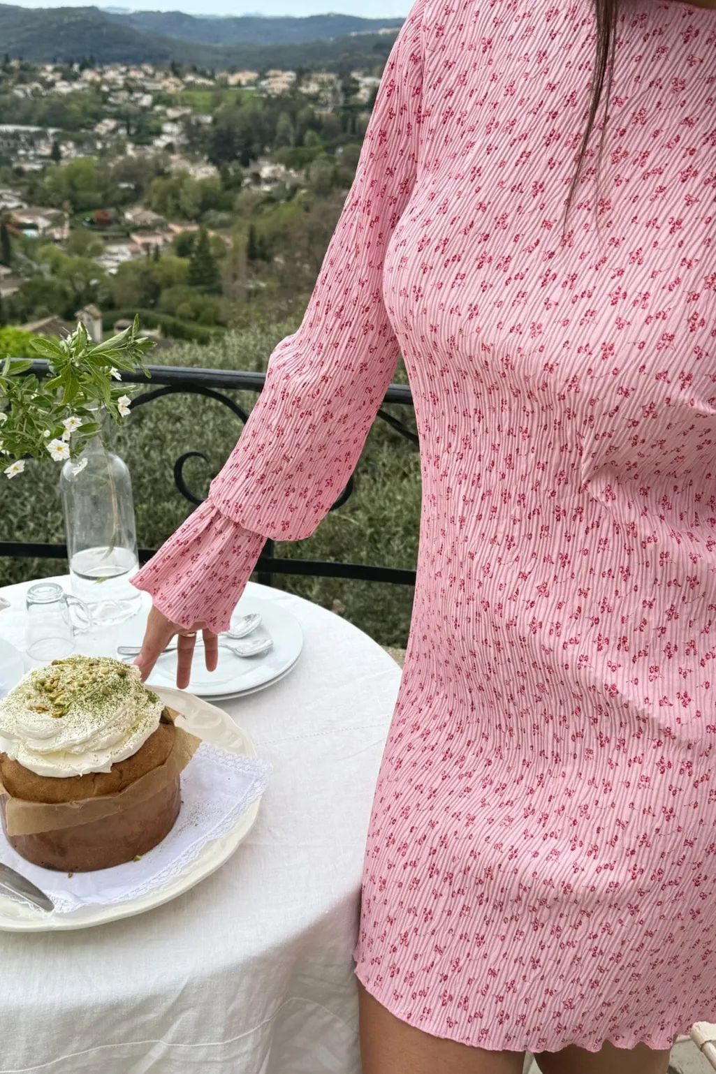 Kort kjole fra BYIC i lyserød med små blomster. Kjolen har en tætsiddende pasform med lange ærmer og rund hals med flæsekant.