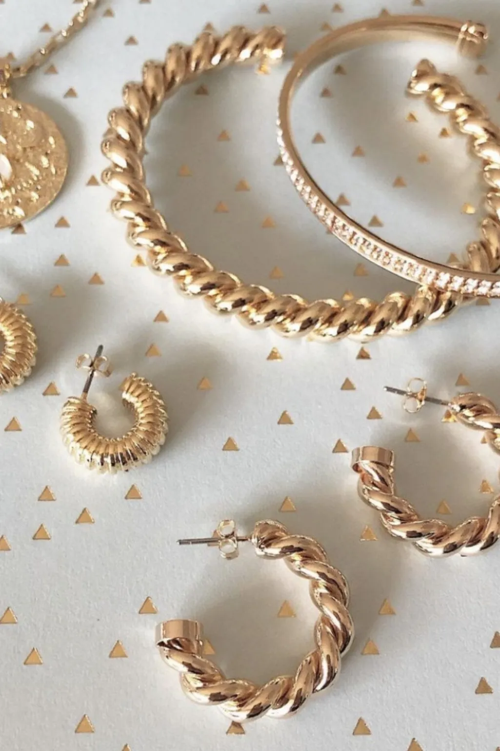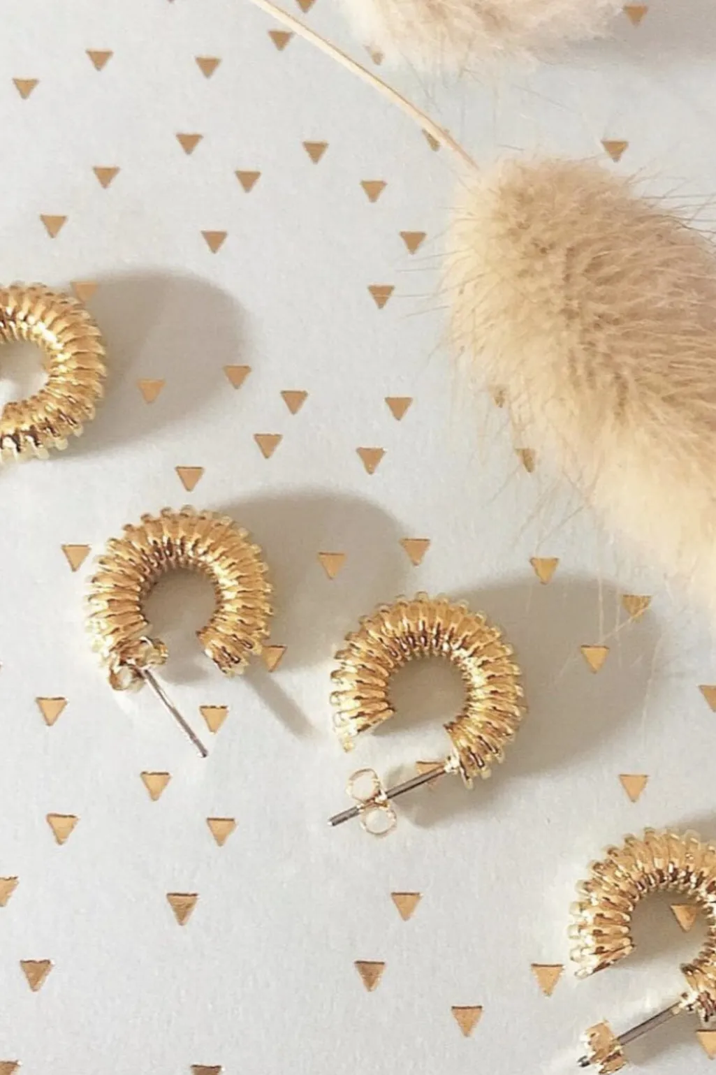 Guldbelagte creol-øreringe med en spiralformet struktur. De har en diameter på 16 millimeter og er fremstillet med et snoet design.